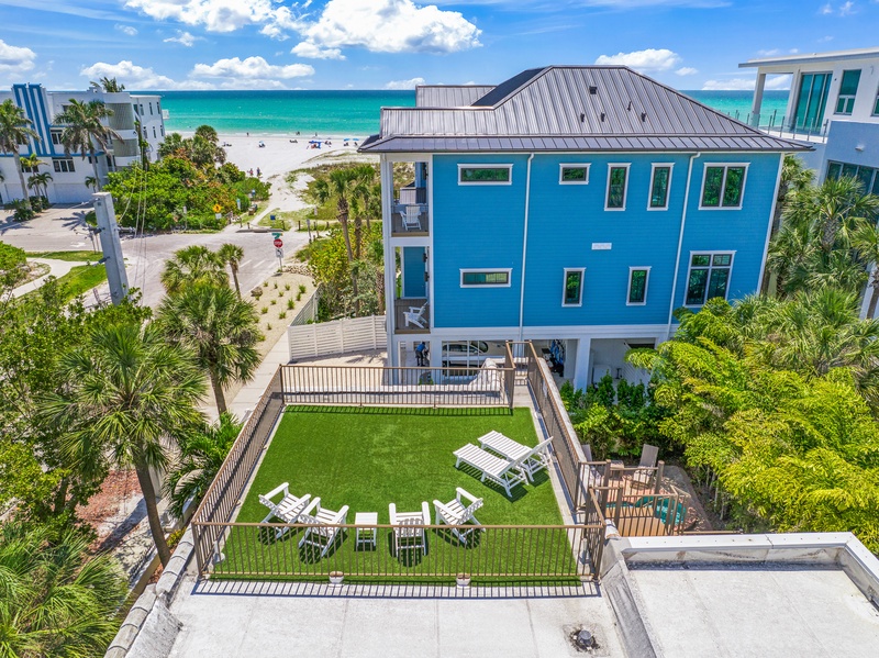Casa Siesta features a stunning front courtyard with a sparkling pool and an in-ground spa surrounded by lounge chairs. In the backyard, you'll find a secluded grass area with additional seating. The rooftop deck, accessible from the second-floor bedroom, offers incredible views—perfect for enjoying sunset cocktails!