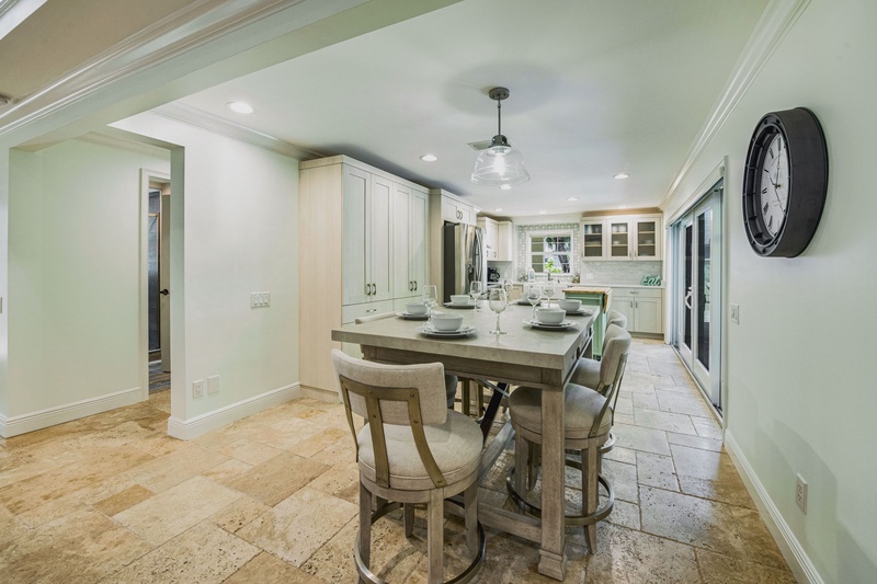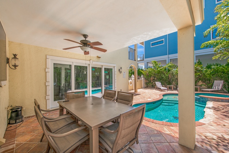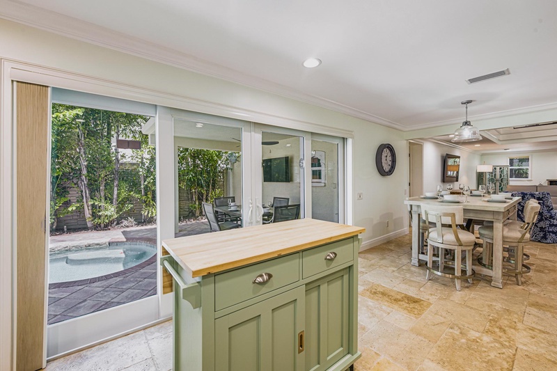 Inside, the vibrant, great room exudes coastal charm, featuring an oversized sofa and loveseat that invite cozy movie nights and shared laughter. The fully equipped chef’s kitchen dazzles with stainless steel appliances and ample counter space, making meal prep a breeze. Gather around the modern dining table or enjoy al fresco dining on the covered patio, complete with an outdoor TV for game day.