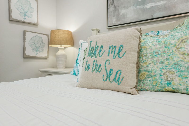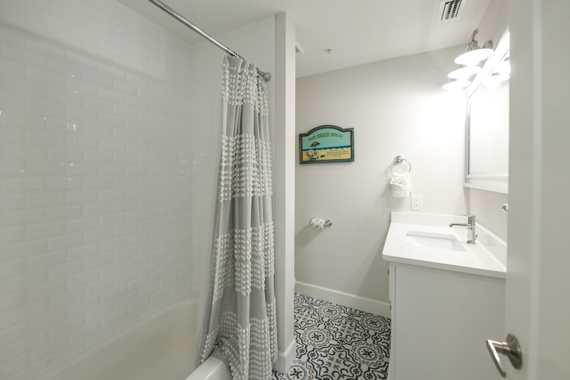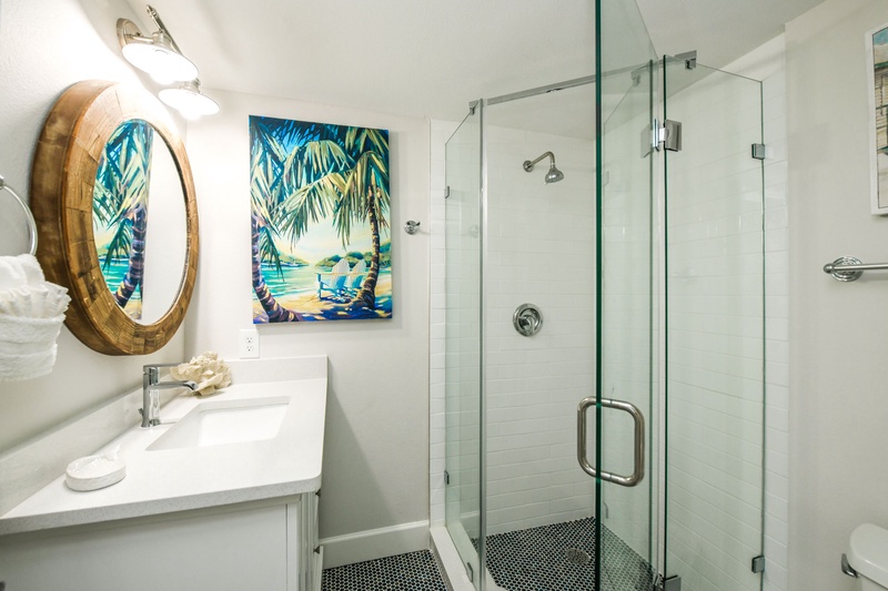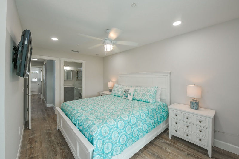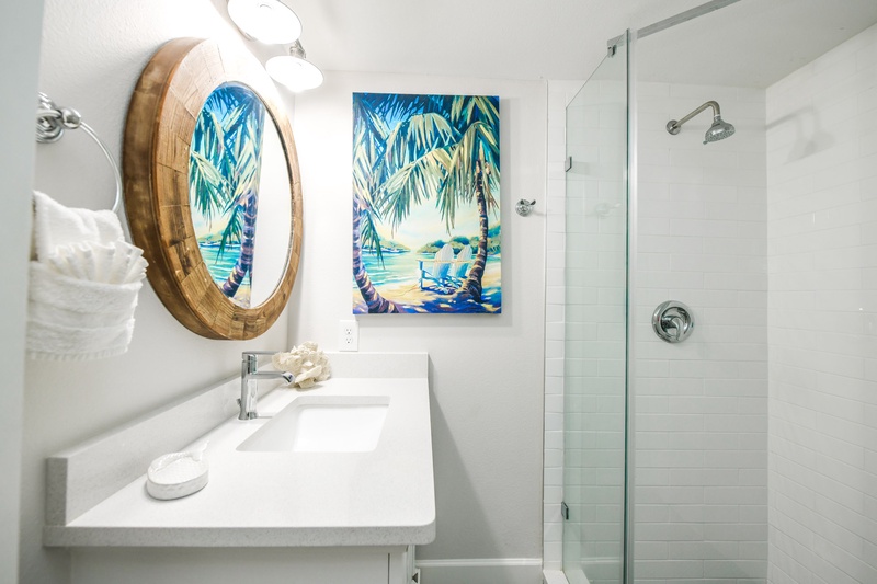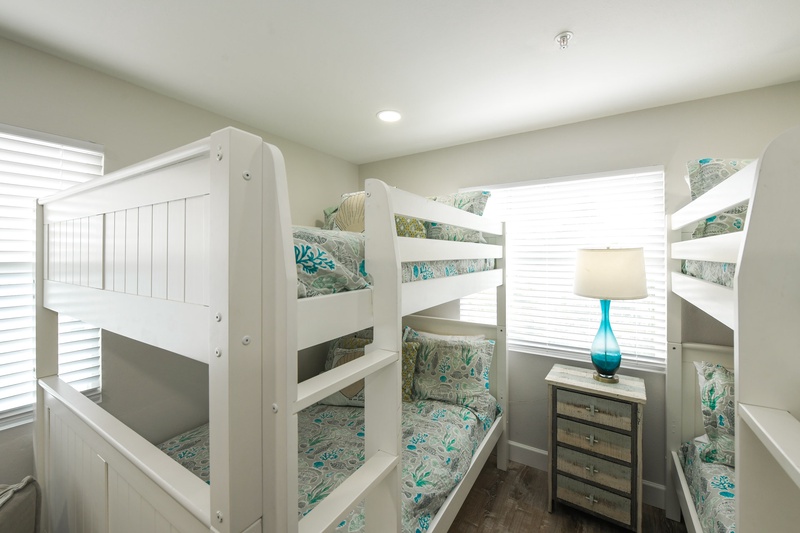 Island Time West has a bright primary bedroom with a King bed, a balcony overlooking the sparkling pool, and an ensuite bathroom with a walk-in shower. The second guest bedroom has tasteful turquoise decor, a balcony, and an ensuite bathroom with a walk-in shower. Across the hall is the third bedroom which is appointed with two bunk beds, a tv, and an ensuite bathroom with a shower and tub combo.