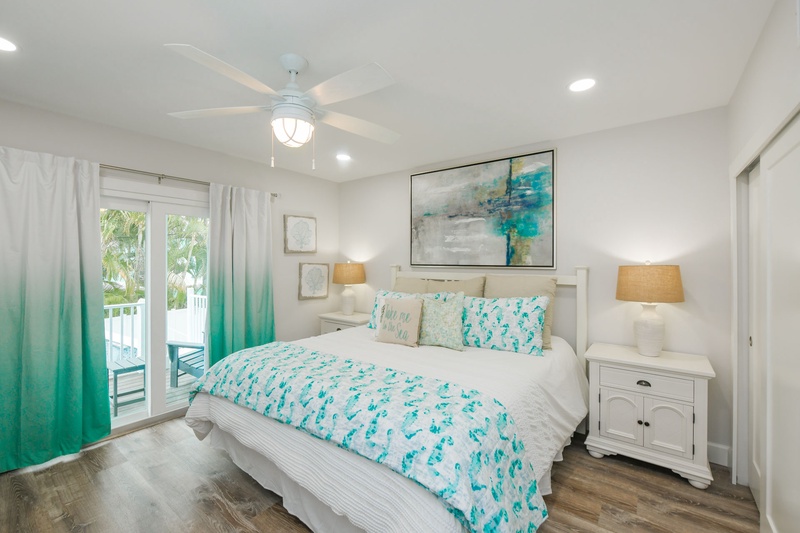 -Primary Bedroom, 2nd floor: King bed, balcony, and ensuite bathroom with walk-in shower
