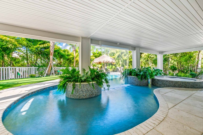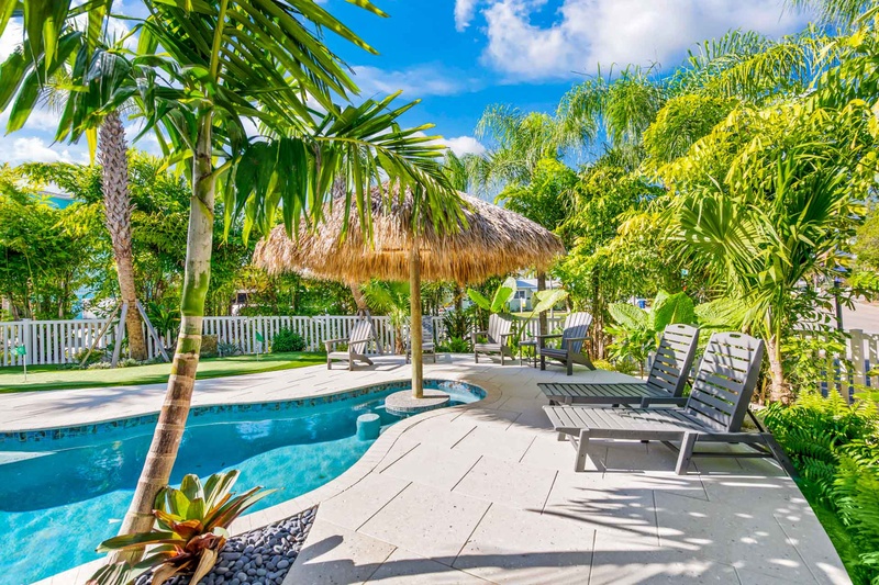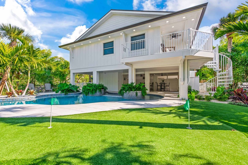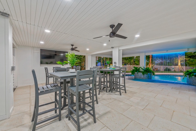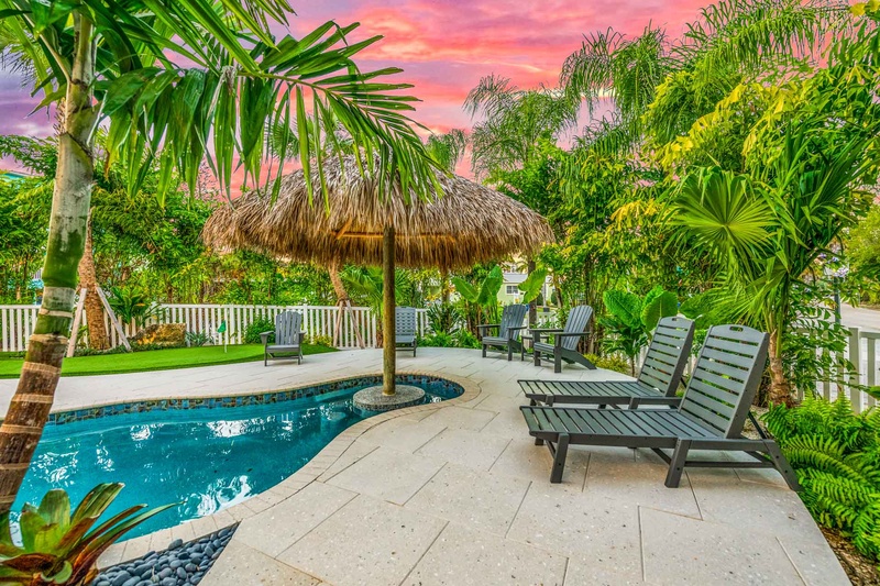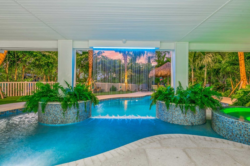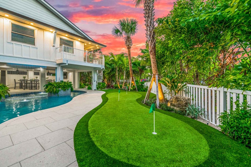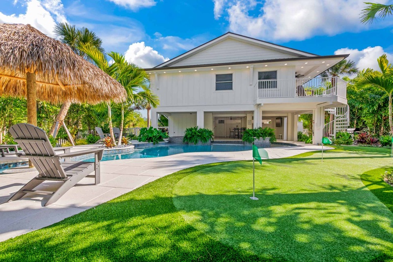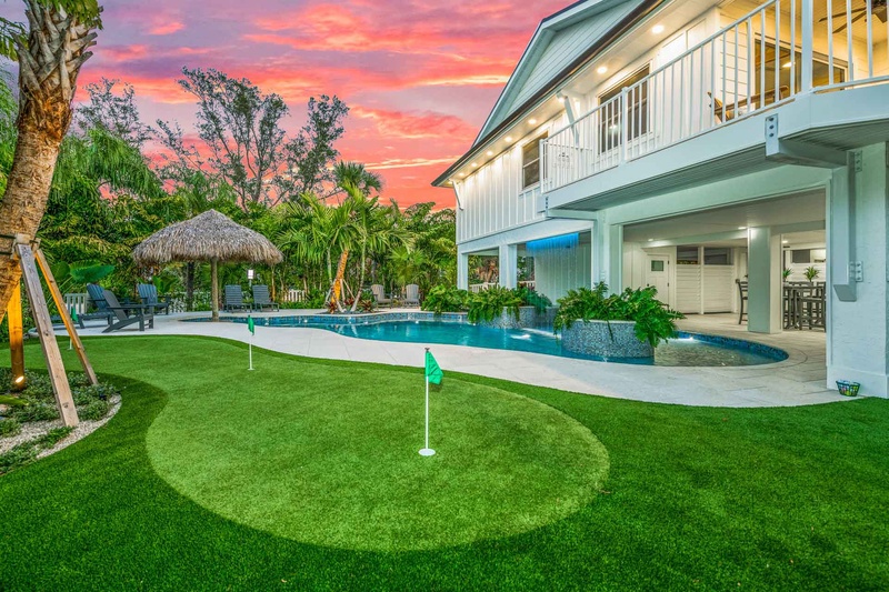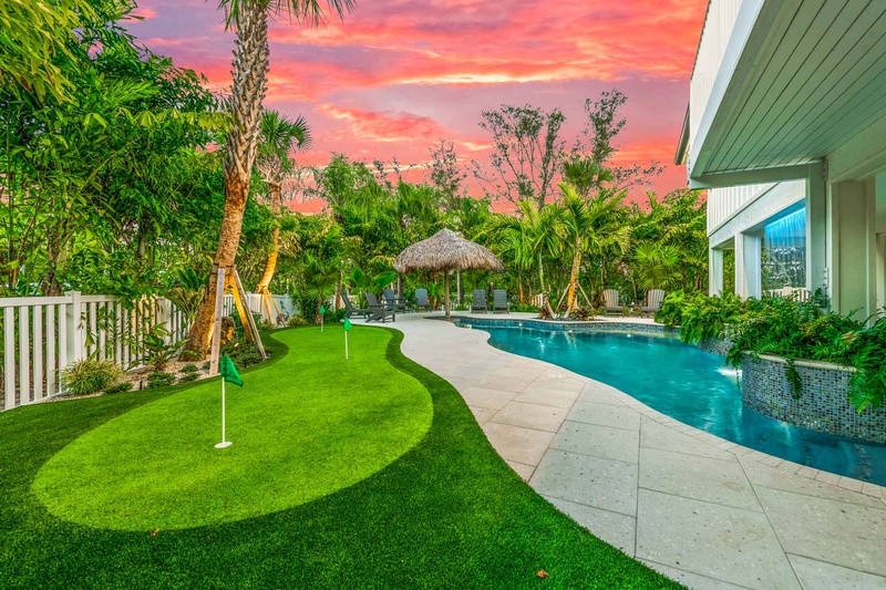 Paradise Cove’s backyard is your personal paradise, designed to feel like a luxurious resort! Jump into the stunning pool featuring a relaxing spa with a captivating water curtain and in-pool planters, creating a tropical oasis. Surrounding the pool, you’ll find plush lounge chairs perfect for soaking up the sun, a fun putting green for friendly competitions, and a grill for sizzling barbecues. Under the shaded patio, enjoy a spacious living area complete with a TV and high-top tables, making it the perfect spot for gatherings, entertainment, or a quiet evening under the stars.