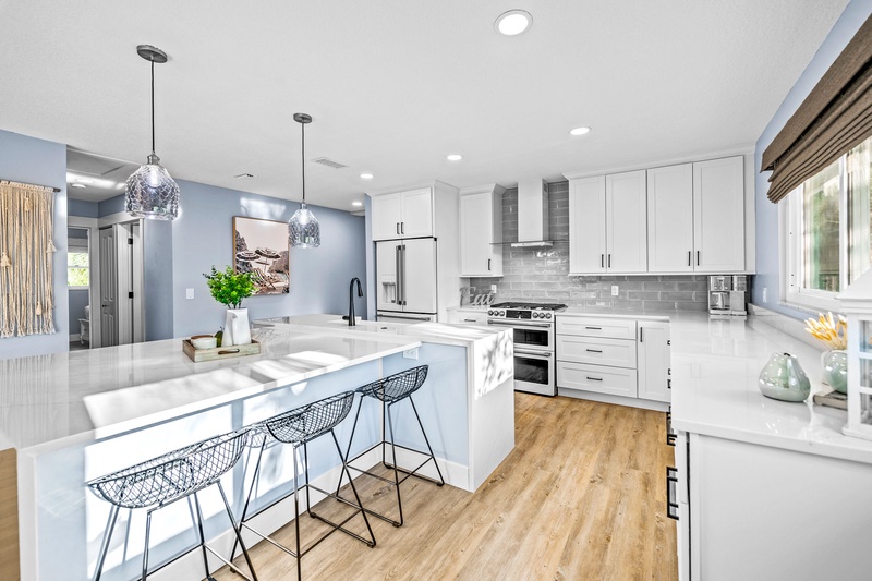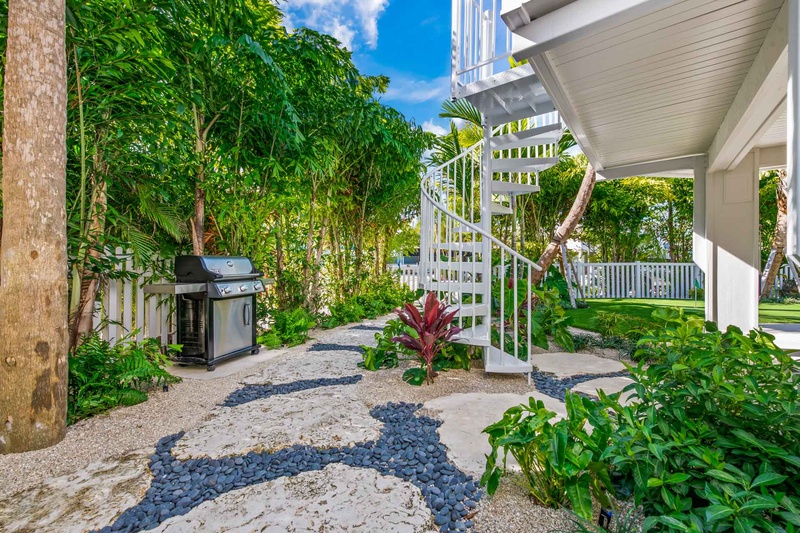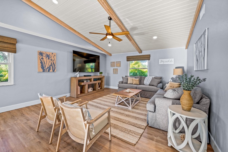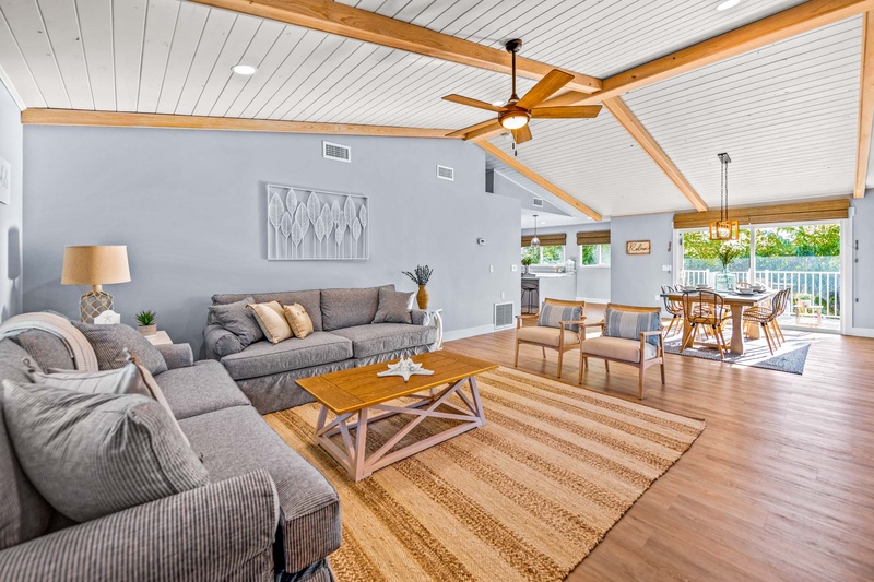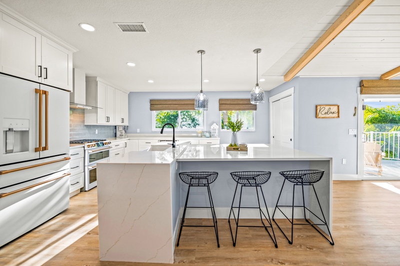 The main living area features an inviting open layout adorned with chic decor that enhances the rustic coastal vibe. The fully equipped kitchen boasts a complete suite of appliances and a spacious center island, making it effortless for multiple cooks to craft delicious meals together. With three bar stools on each side, there’s plenty of room for casual dining, along with a dining table set for six. A cozy seating area with a sofa and large TV is perfect for relaxation, and the balcony offers additional dining space and direct pool access via a spiral staircase.