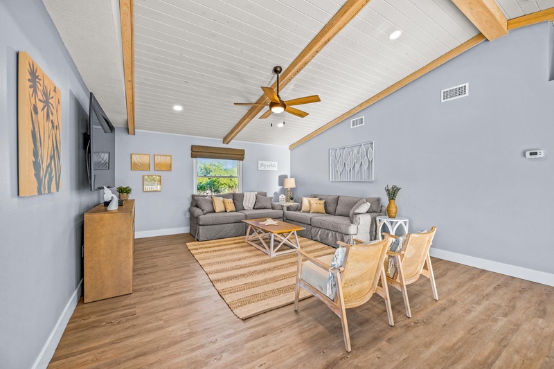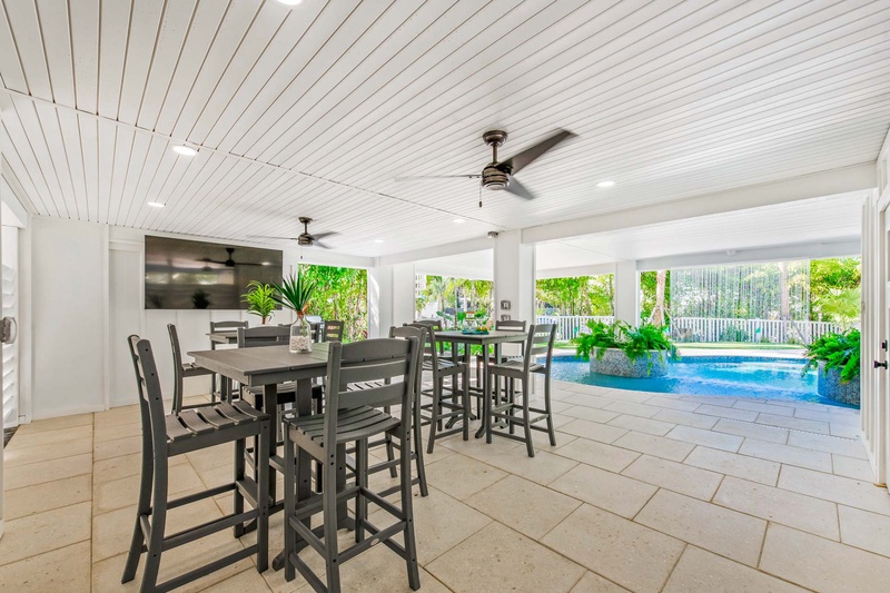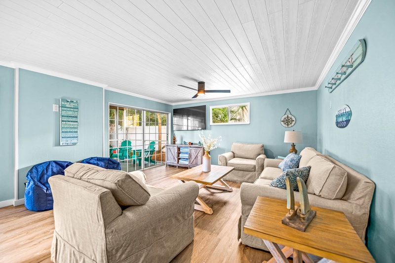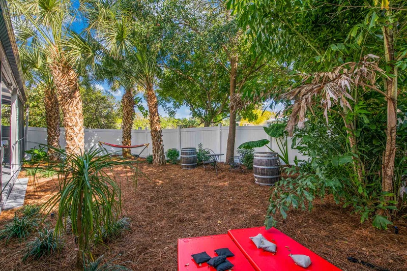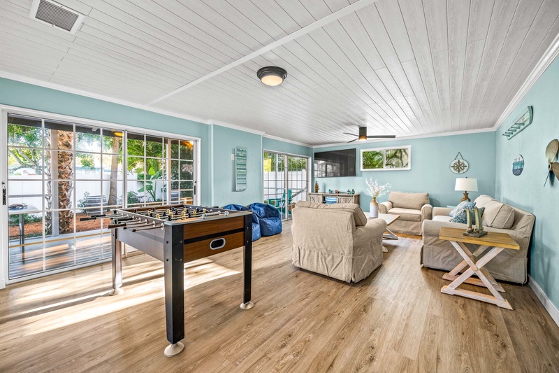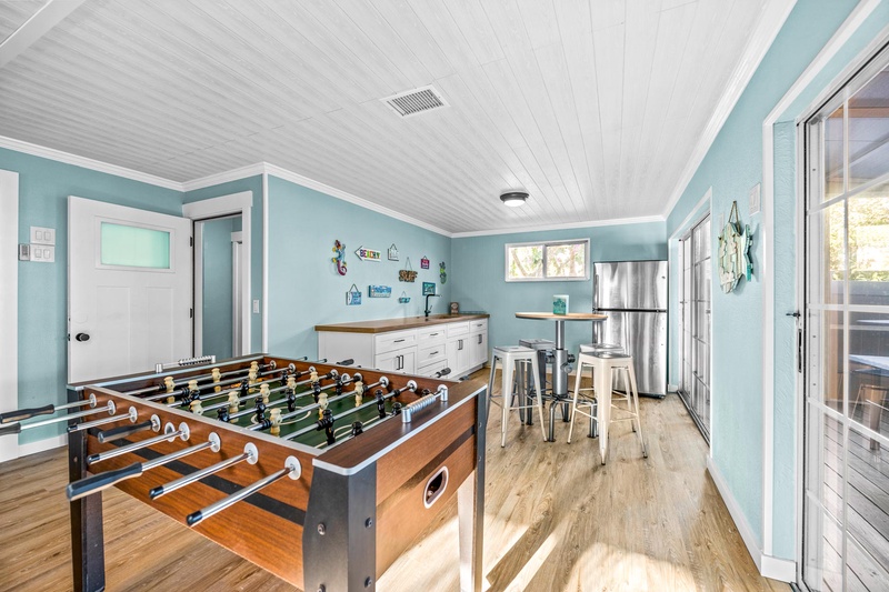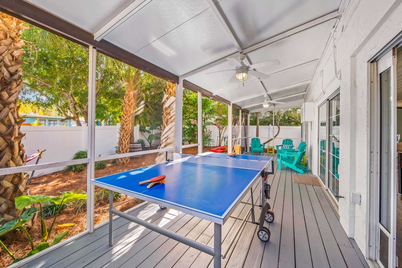 The fun never stops at Paradise Cove! The downstairs living area boasts a lively wet bar and bar top seating for four, making it the perfect spot to gather. Enjoy friendly competitions with a foosball table, comfortable seating, and a TV for entertainment. Just off this area, you'll find a screened-in patio featuring a ping pong table, perfect for some friendly matches. Beyond that, a delightful garden area awaits, complete with cornhole, additional seating, and an outdoor shower.