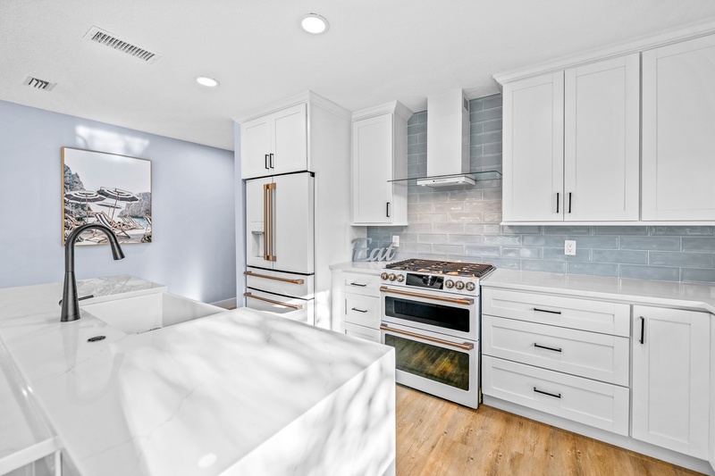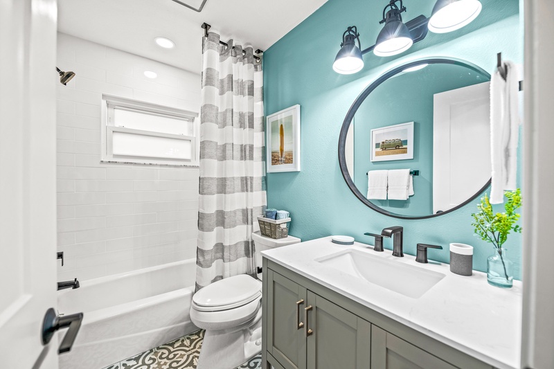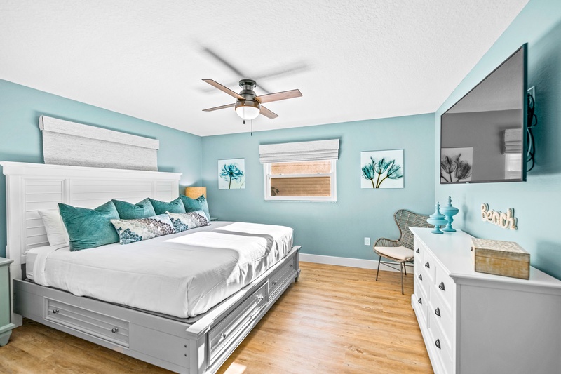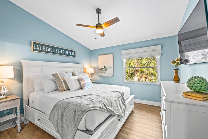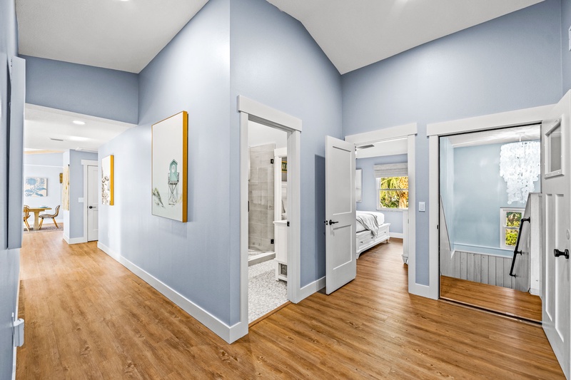 With families in mind, this home features three beautifully decorated king bedrooms, each showcasing elegant beach decor, luxury bedding, and ensuite bathrooms equipped with walk-in showers. There's an additional king bedroom that provides convenient access to a hall bath with a walk-in shower, ensuring comfort for all guests. The fifth bedroom is designed for fun, featuring a playful bunk bed, perfect for kids, and easy access to a hallway bath with a shower and tub combination. Each bedroom includes a TV for entertainment, and a washer and dryer add convenience for your family during your stay.