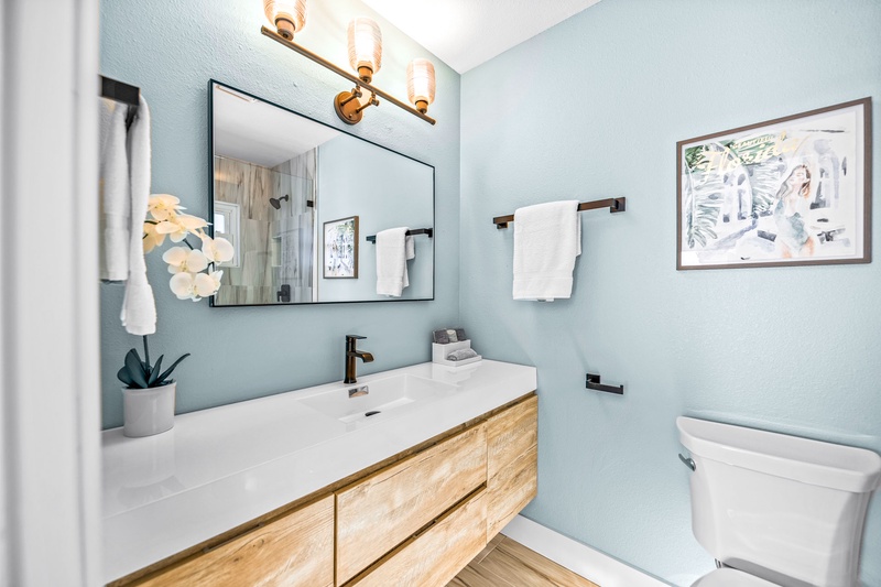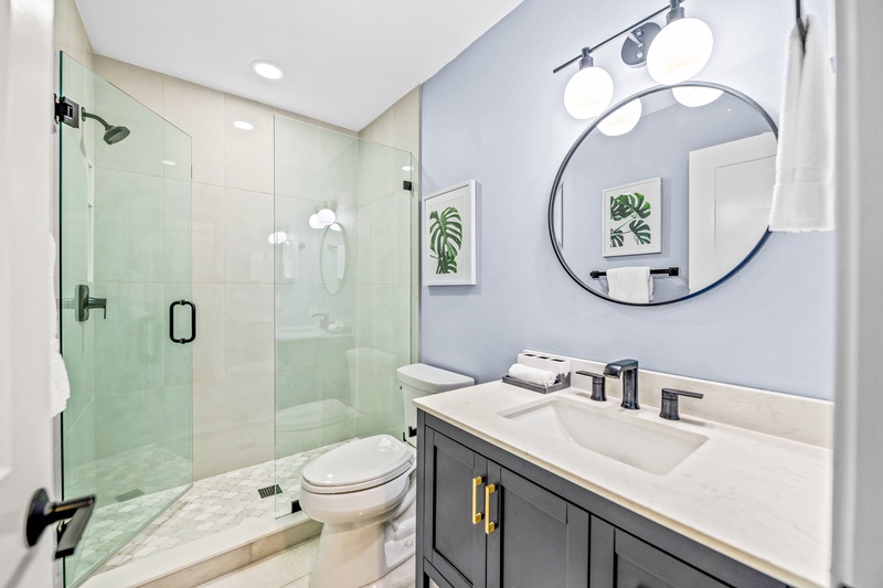 -Primary Bedroom, 2nd floor: King bed and ensuite bathroom with walk-in shower