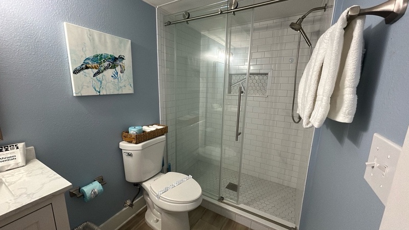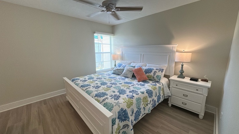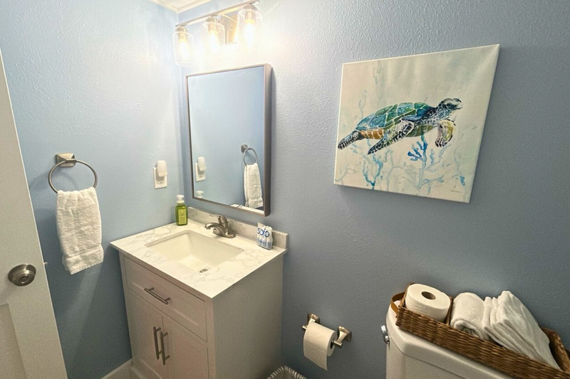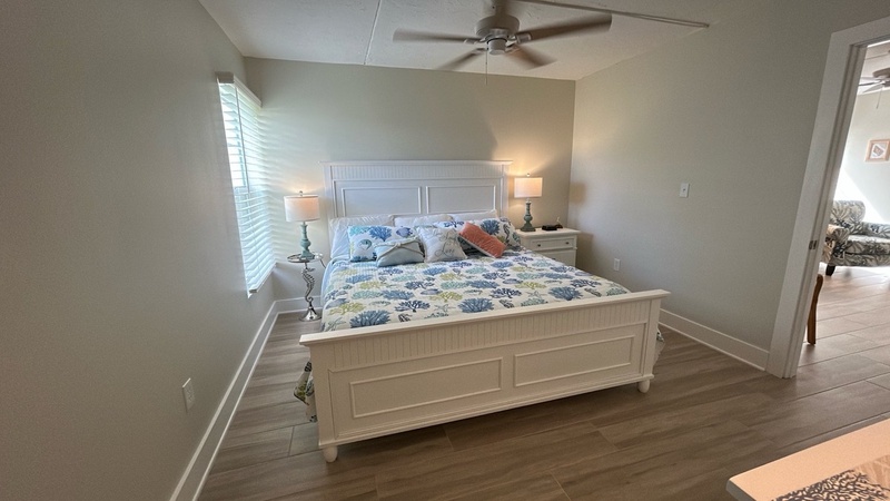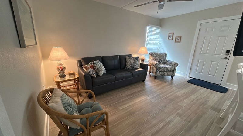 Inside, the condo has been fully remodeled to feature bright coastal decor, comfortable furnishings, and an open layout designed for relaxing. The living room includes a sleeper sofa and flat-screen TV, while the remodeled kitchen comes complete with updated appliances, cabinetry, and a newly added dishwasher for added convenience. The dining table seats four, perfect for enjoying meals or planning your island adventures.