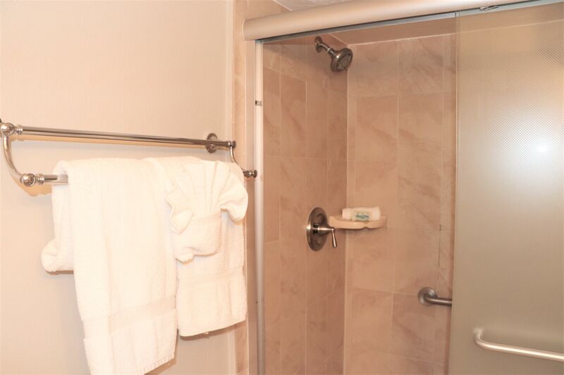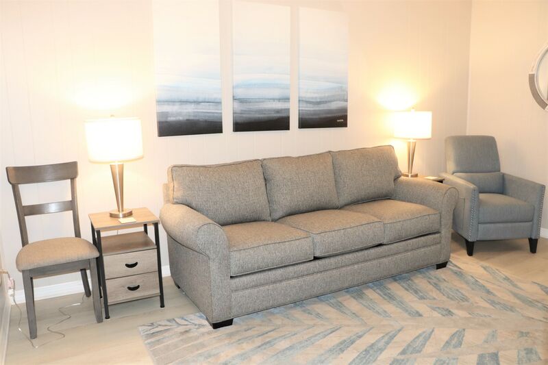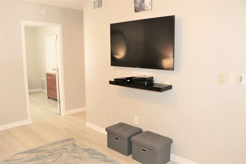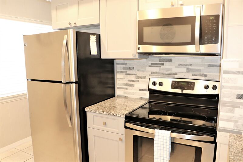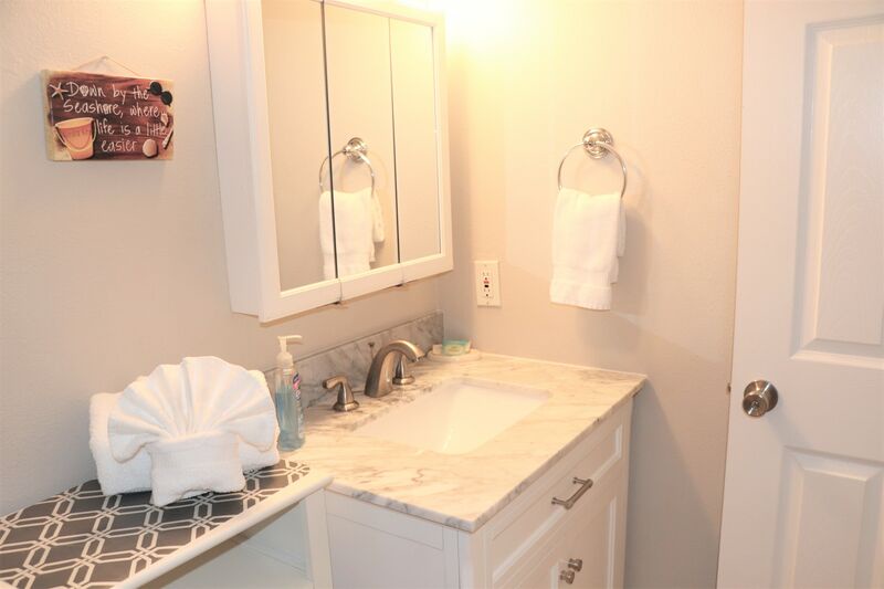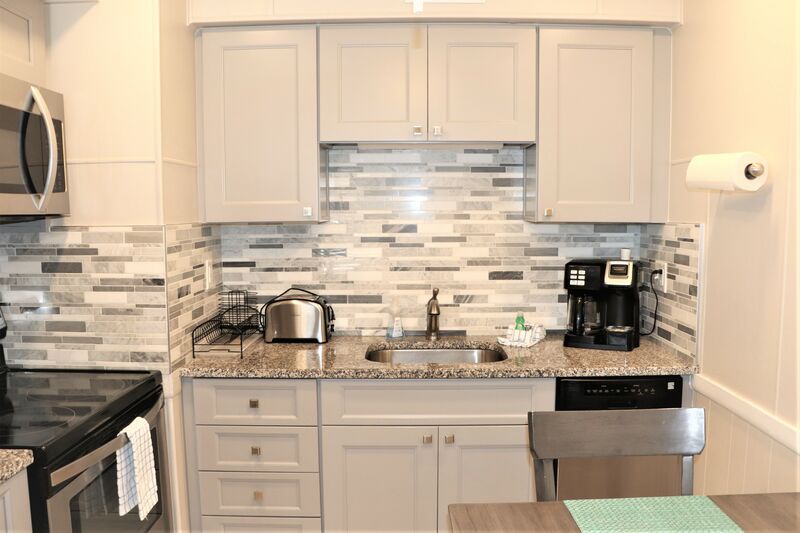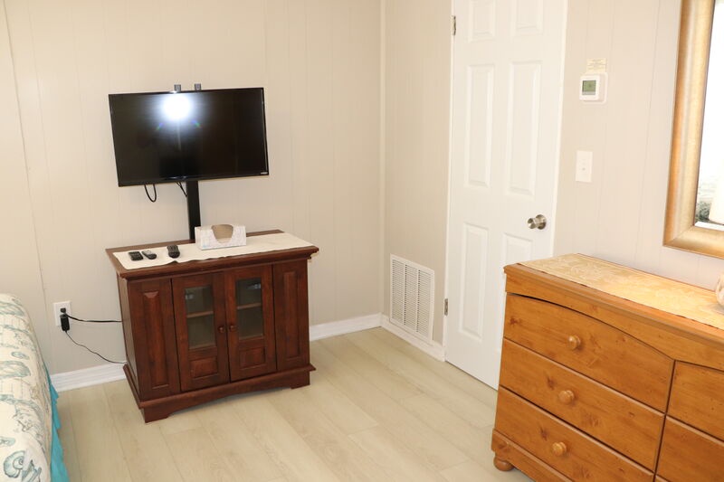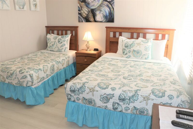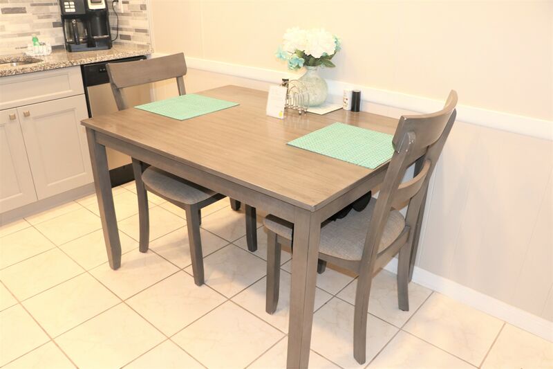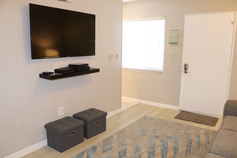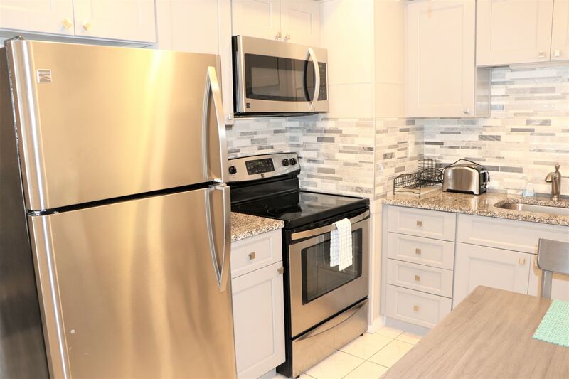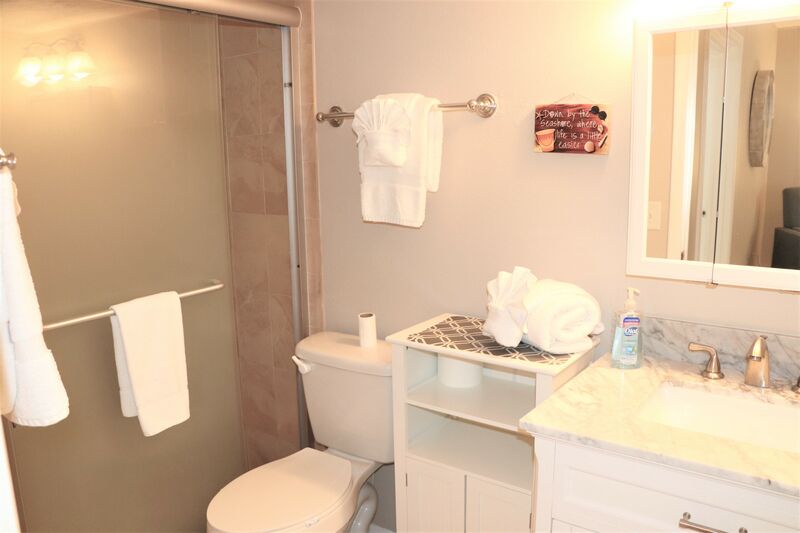 Inside, you’ll find a simple, modern living space with a comfy sofa and a TV, perfect for unwinding after a day at the beach. The updated kitchen boasts a full suite of appliances and essential cookware for preparing quick meals, along with a cozy kitchen table set for two. In the bedroom, parents can enjoy the Queen bed while the child sleeps comfortably in the Twin bed. The hall bath features a convenient walk-in shower.