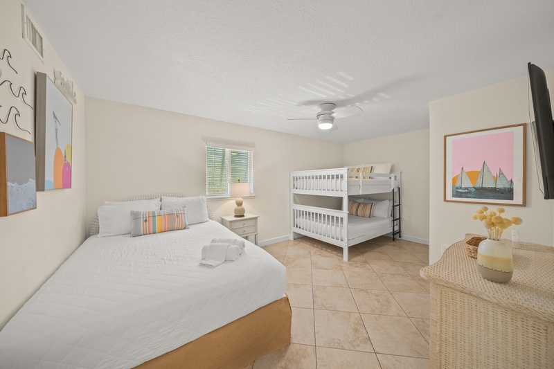 Rest and refresh in the primary bedroom, with a colorful seaside decor, a king bed, and an ensuite bathroom with a walk-in shower. The second bedroom has a queen bed and a double over double bunk bed, and the hallway bathroom has a shower and bathtub combination.