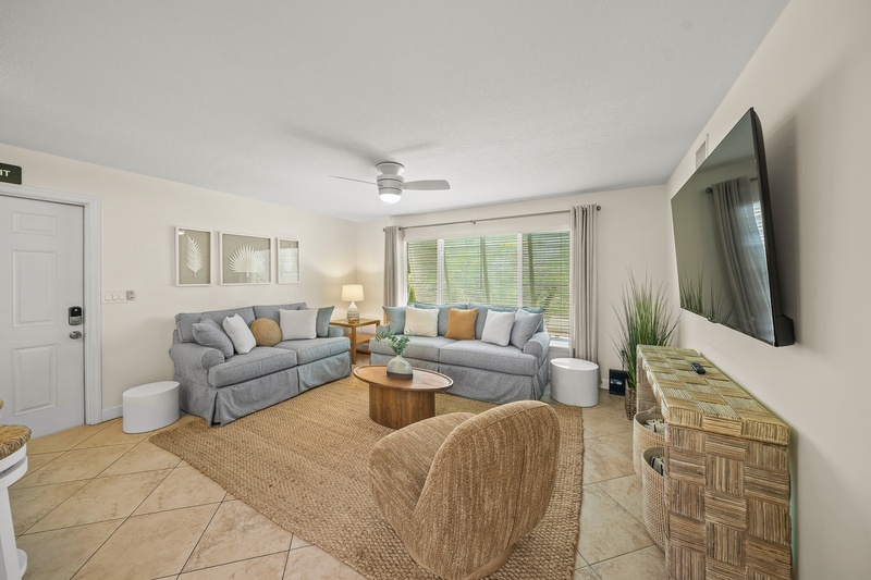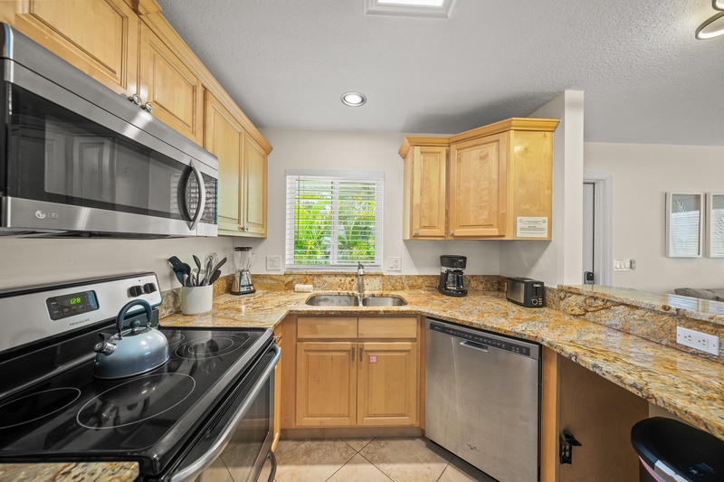 You will love the beach decor and colors as you enter the open living space. The family room has inviting conversational seating, perfect for watching a show after a day at the beach. In the kitchen, you will find stainless steel appliances, cooking essentials, and granite countertops with seating. Dine at the kitchen table or head outside for a lovely BBQ on the shared grill.