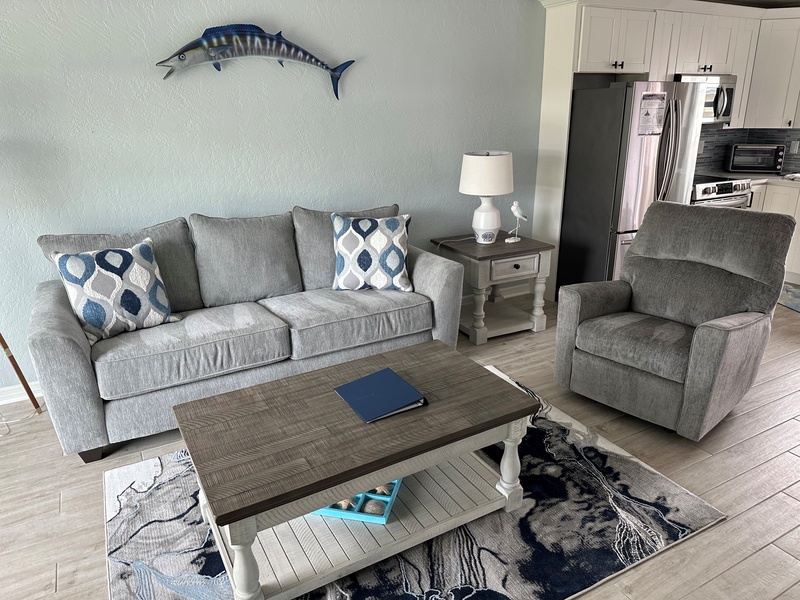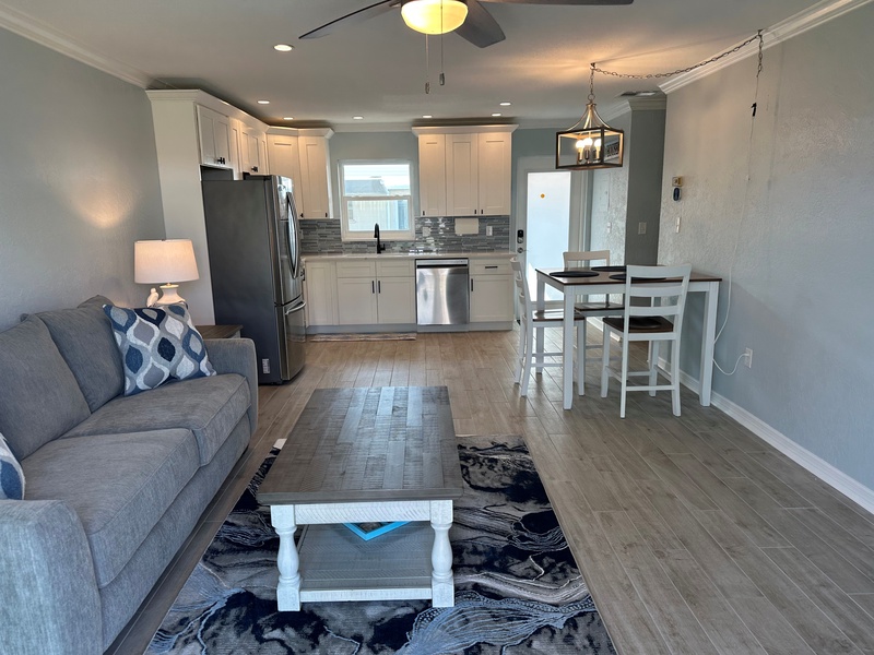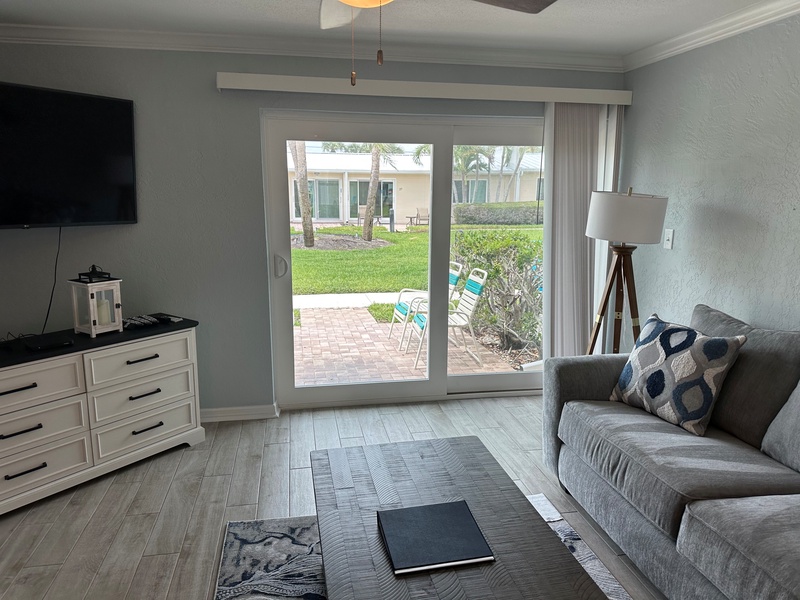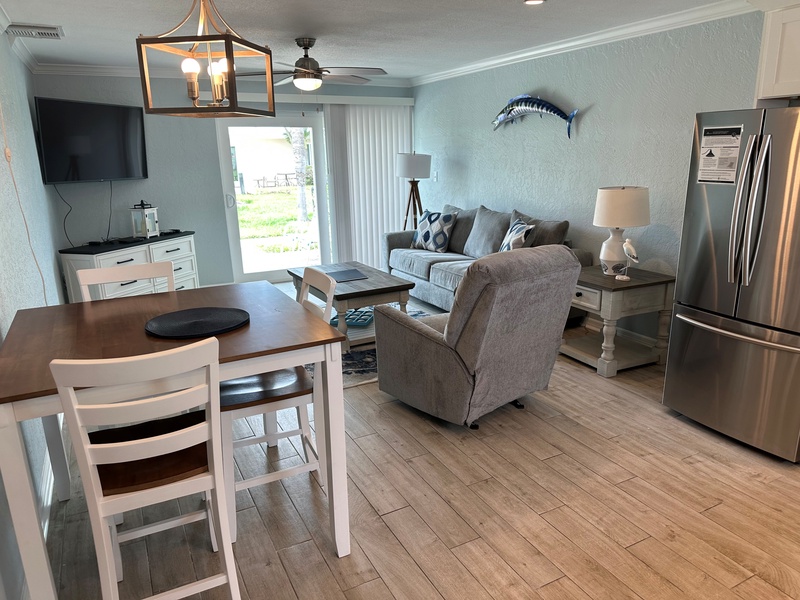 Inside, this condo features fresh upgrades including new flooring, updated kitchen cabinetry, and modern furnishings. The bright living room includes a queen sleeper sofa, flat screen TV, and sliding doors that open to the patio. The fully equipped kitchen provides everything needed for meals at home, while the dining area creates a welcoming space for enjoying breakfast before heading to the beach.
