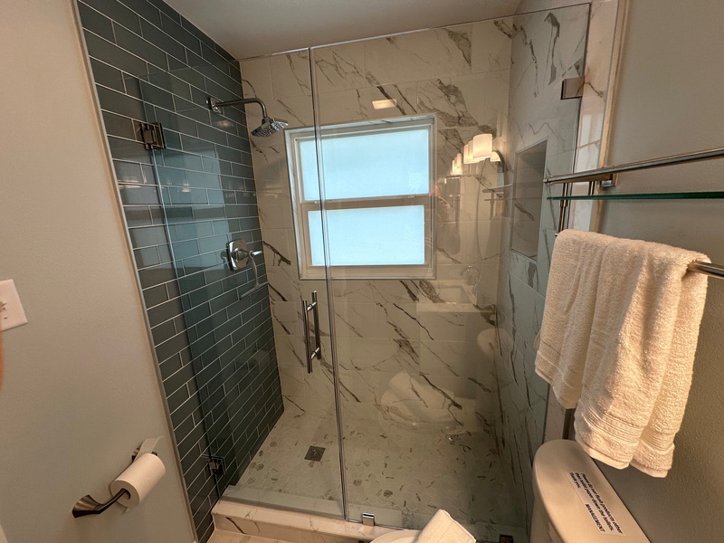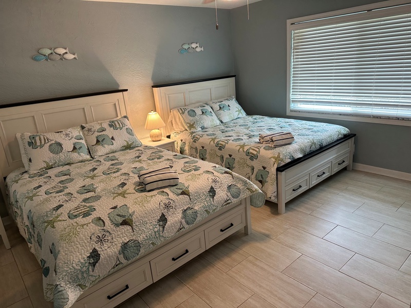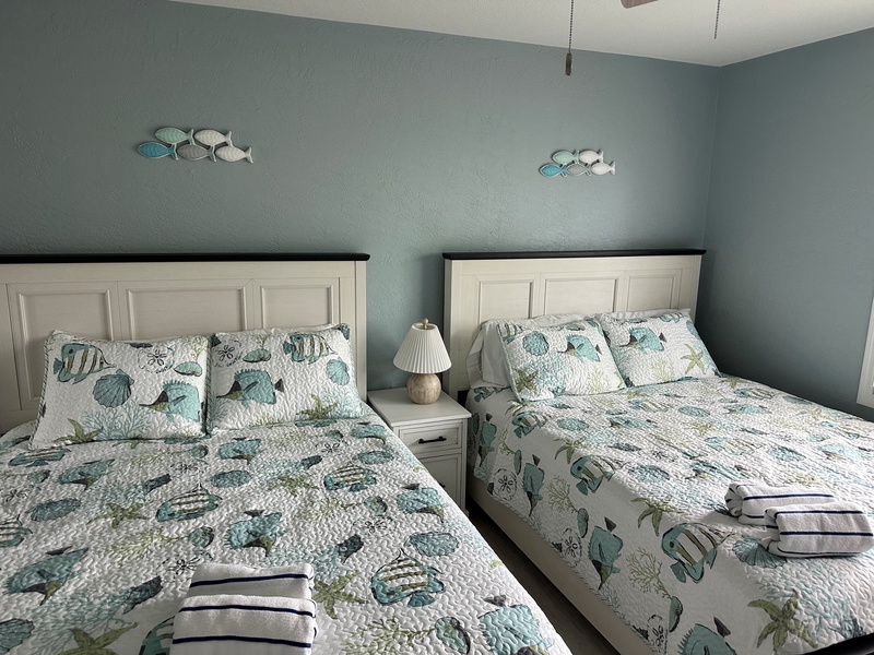 The spacious bedroom features two queen beds, updated furnishings, and plenty of storage for extended stays. The hallway bathroom offers a walk-in shower and a single vanity. Thoughtful touches throughout the condo make it easy to unwind after full days spent enjoying the pool and beach.