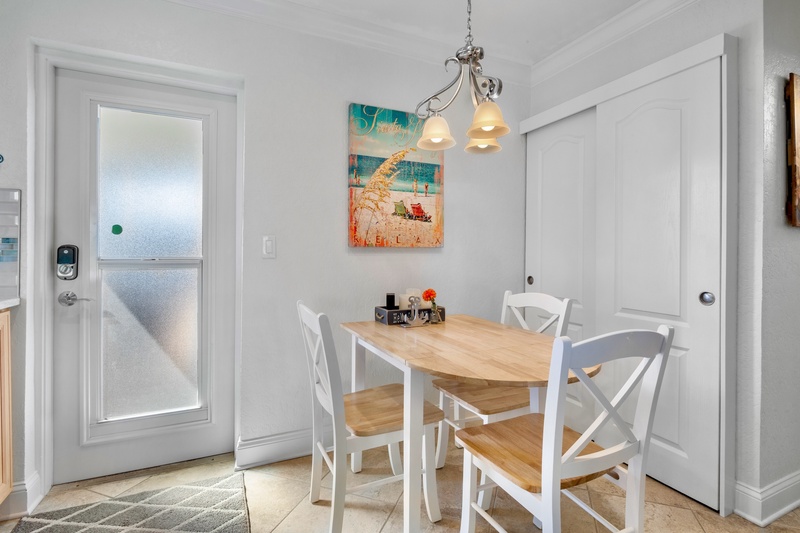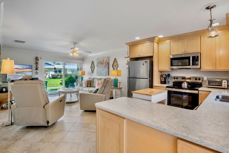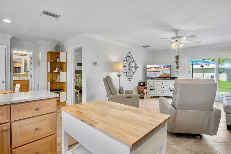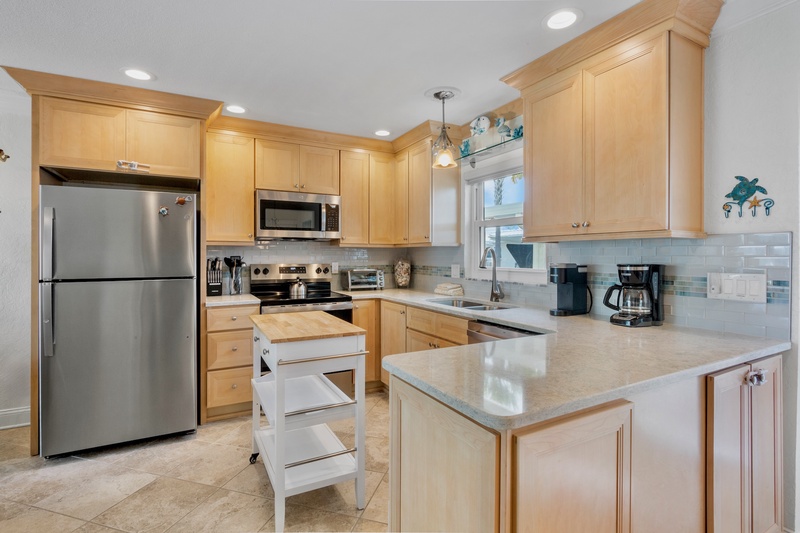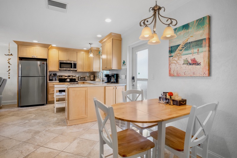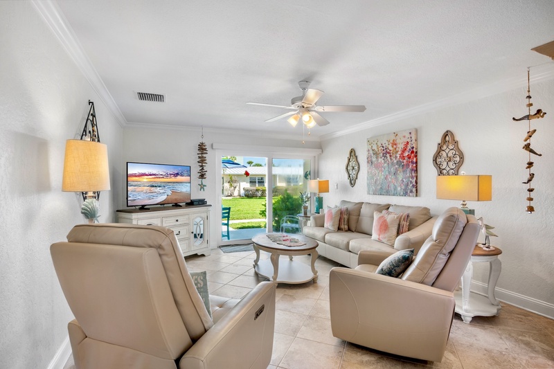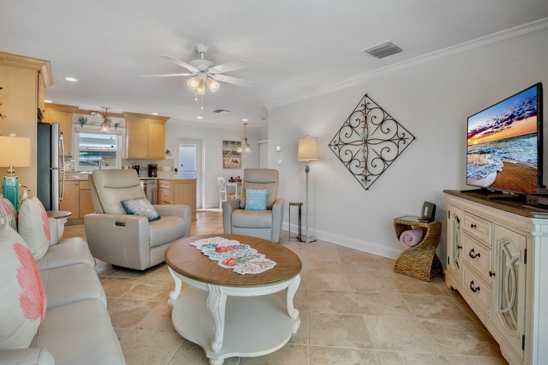 Inside, you’ll find a modern open-concept layout designed for comfort and relaxation. The living area features plush reclining chairs, a cozy sofa that converts to a queen sleeper, and a smart TV for movie nights after a day at the beach. The fully equipped kitchen boasts stainless steel appliances, ample counter space, and both a coffee maker and Keurig for your morning brew. A dining nook for four invites you to share meals in a relaxed, coastal-inspired setting.