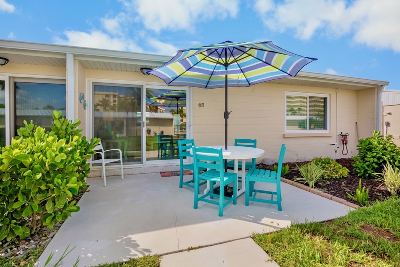 • Outdoor patio with seating and umbrella