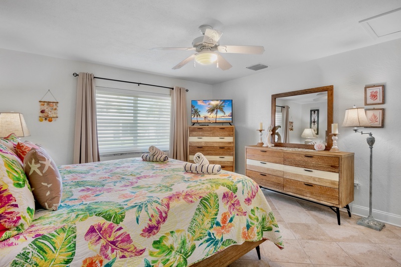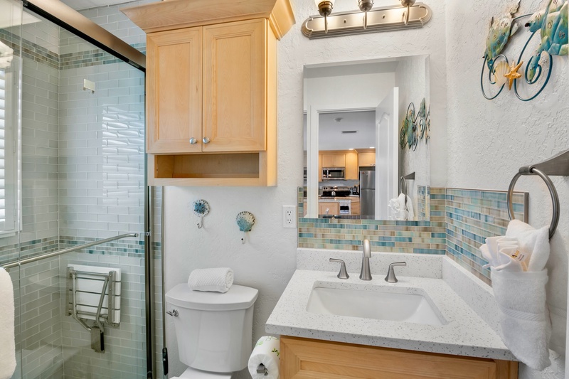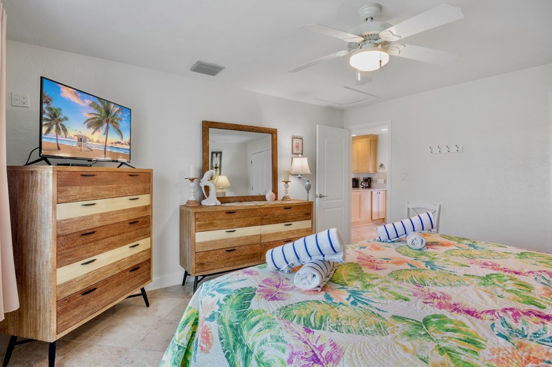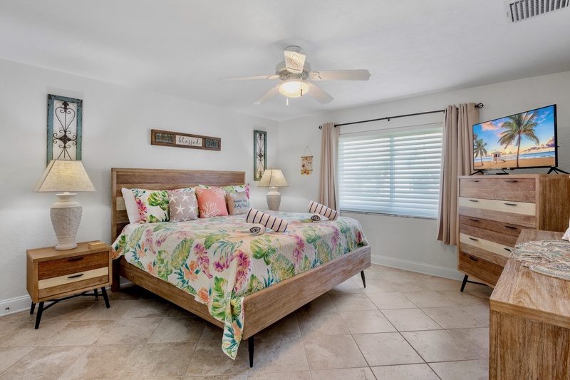 The primary bedroom offers a comfortable king-sized bed, coastal decor, and a ceiling fan for breezy nights. The full bathroom includes a walk-in shower with grab bars and a built-in seat, providing convenience and accessibility for all guests.