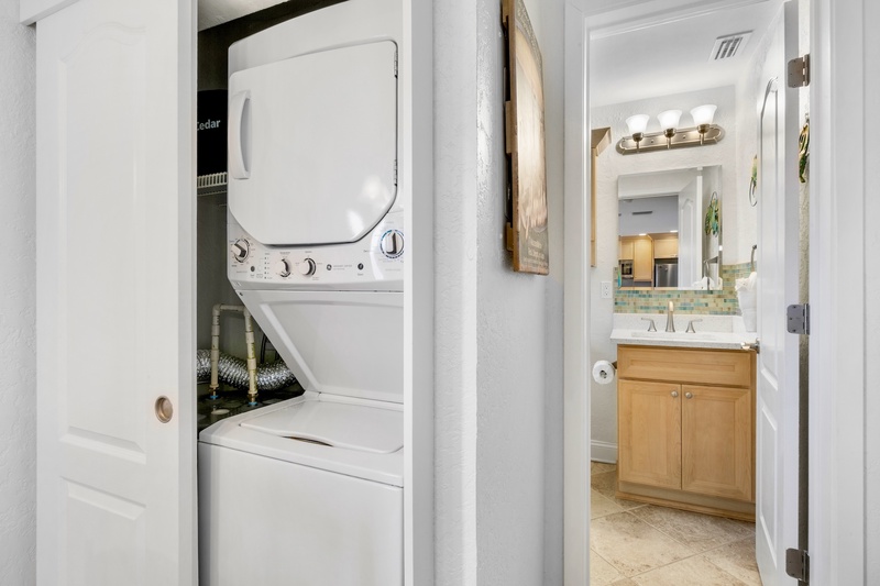 Washer and dryer combo, complimentary Wi-Fi, assigned parking, beach chairs, and community amenities are all included for a stress-free stay.
