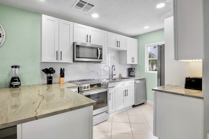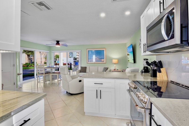 Step inside and experience an open and airy living area with elegant coastal decor and panoramic Gulf views. The spacious layout includes a comfortable sitting area with a large Smart TV, a queen sleeper sofa, and access to the adjoining lanai, ideal for reading or accommodating extra guests. The kitchen is equipped with full-size stainless-steel appliances, granite countertops, and all the essentials for preparing meals at home. A washer and dryer are provided for added convenience, ensuring your stay feels like home from the moment you arrive.