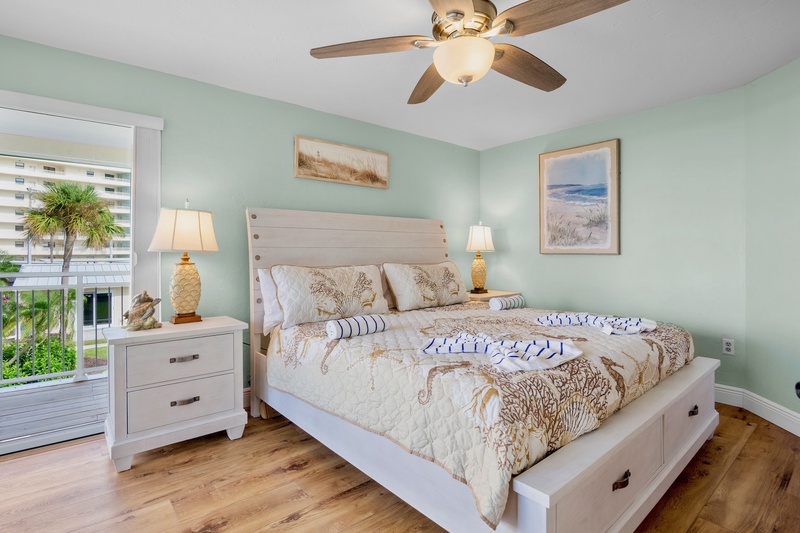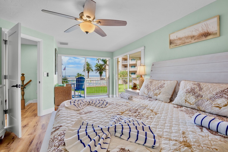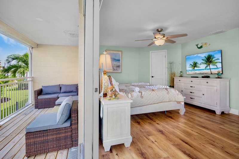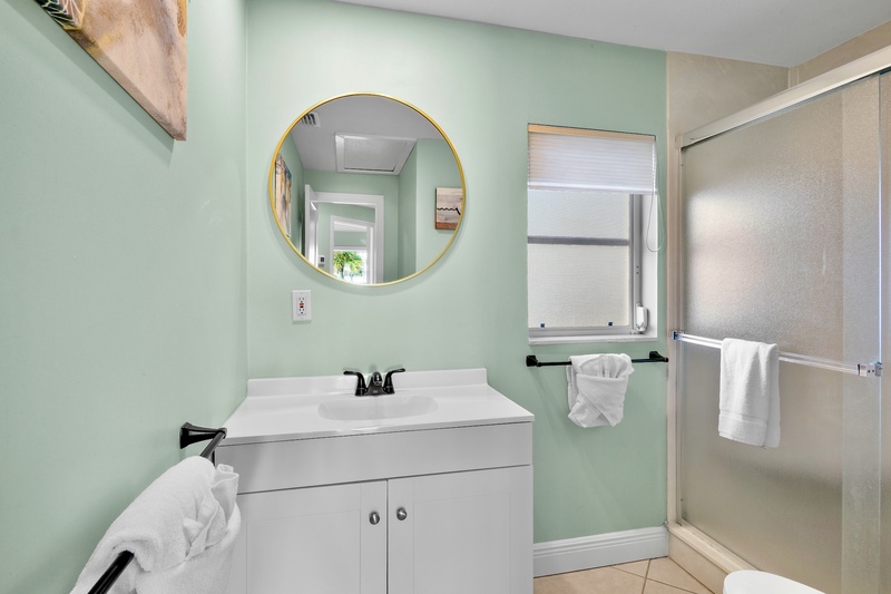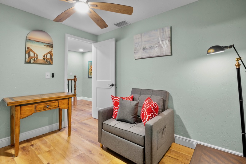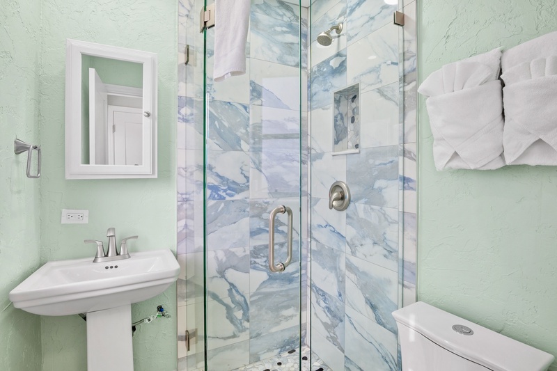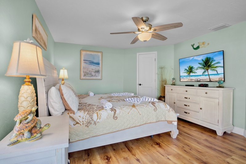 The primary bedroom suite offers a king bed, a TV, and a private ensuite bathroom with a walk-in shower and built-in seat for added comfort. The bonus room provides additional space for reading, relaxing, or accommodating guests. A second full bathroom on the main floor adds convenience for larger groups or families. Every detail, from modern finishes to soft linens, creates a soothing coastal atmosphere designed for rest and relaxation.