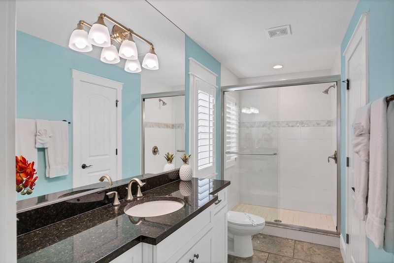 -Fourth Bedroom, 3rd floor: King bed and ensuite bathroom with double vanity and walk-in shower