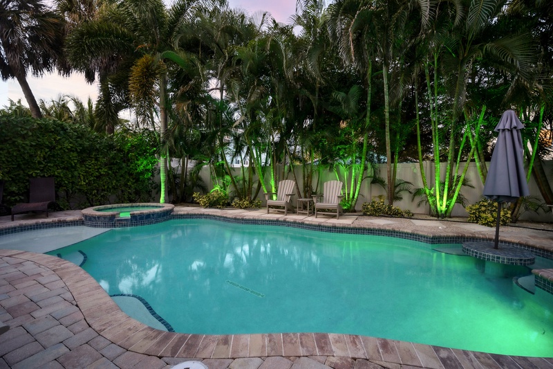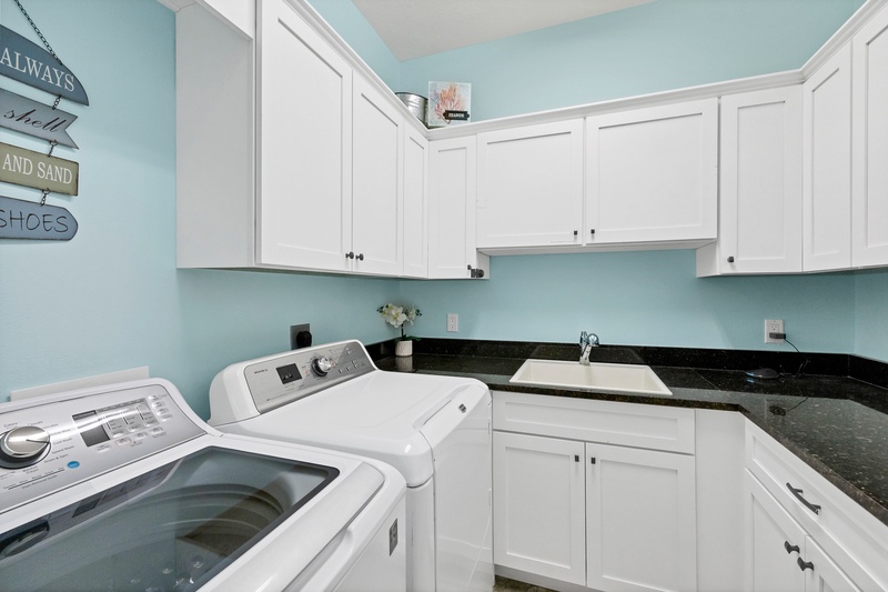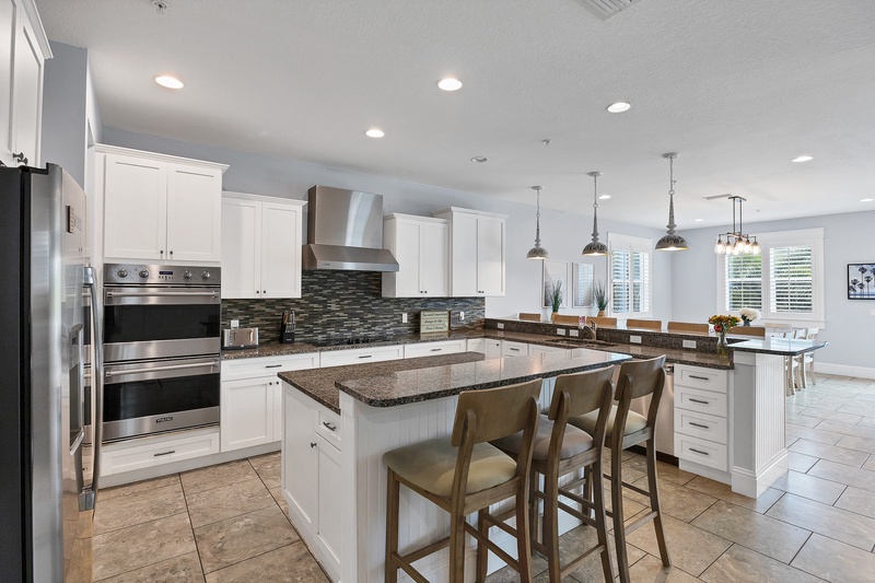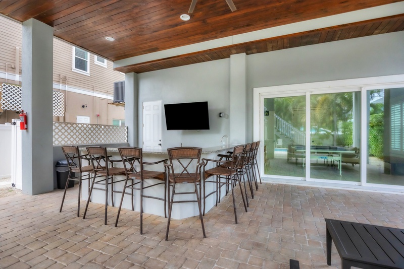 Your tropical oasis awaits! This home has an incredible pool with an in-ground spa that is certain to delight guests of all ages. You’ll find ample lounge chairs around the pool and the real star is the covered patio! It has an outdoor dining table, cozy seating area, and a bar with a sink, fridge, television, and a generous amount of bar stools