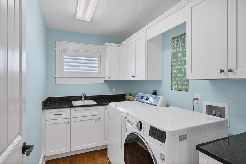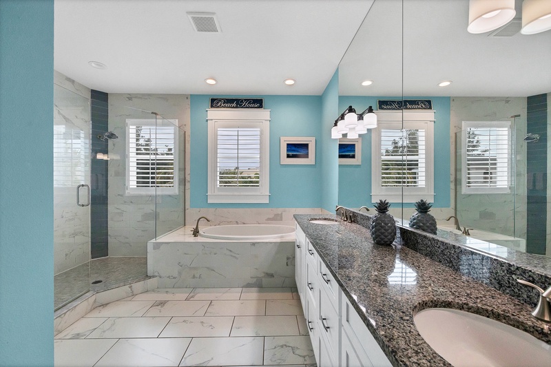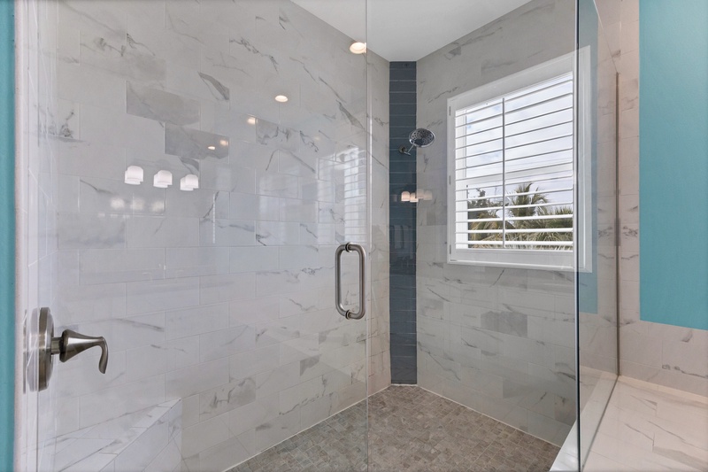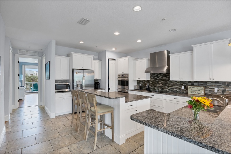 The second and fourth floors boast the most spacious and luxurious rooms, complete with comfortable King size beds, walk-in closets, and private balconies. From the fourth floor balcony, you'll be able to soak in the stunning beach view. These primary rooms also feature ensuite bathrooms that are generously sized, with premier double vanities, walk-in showers, and soaking tubs to pamper yourself. In addition, there are four more king bedrooms - two of which come with their own ensuite bathrooms. And there are two bunk bedrooms that are perfect for the younger guests. Plus, there's a hall bathroom with a convenient walk-in shower, half bath, and laundry room on both floors.