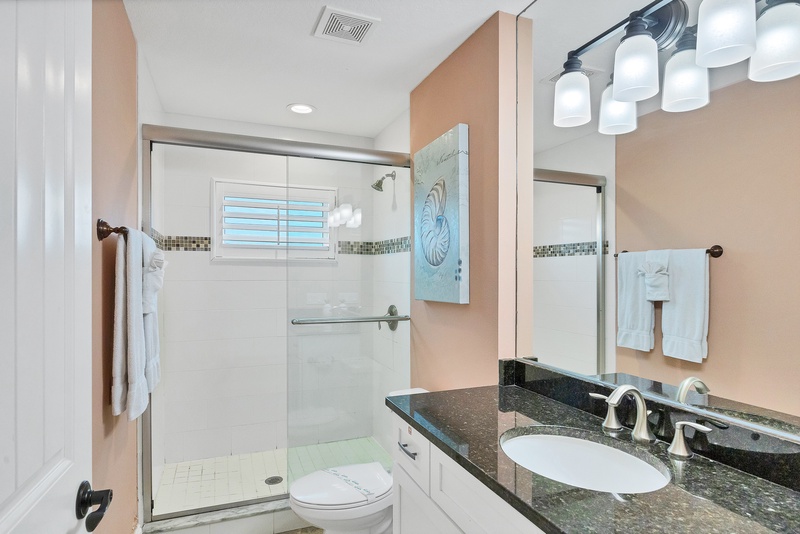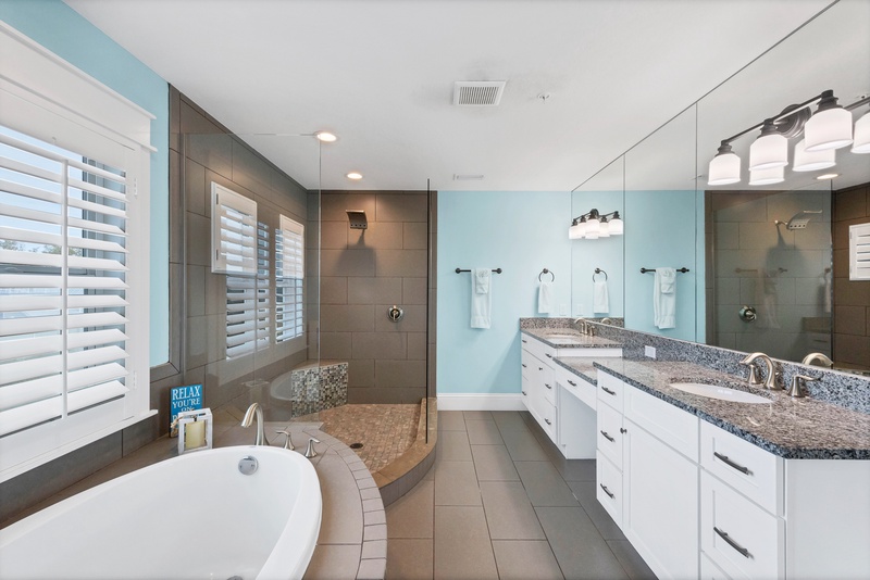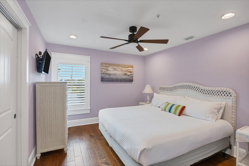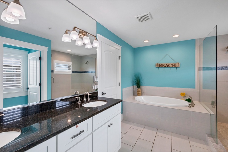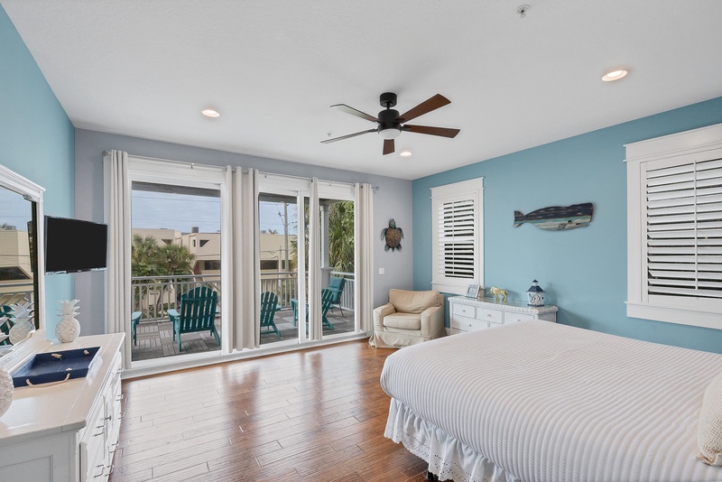 -Second Bedroom, 2nd floor: King bed, balcony, and ensuite bathroom with walk-in shower and tub