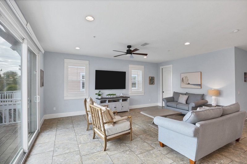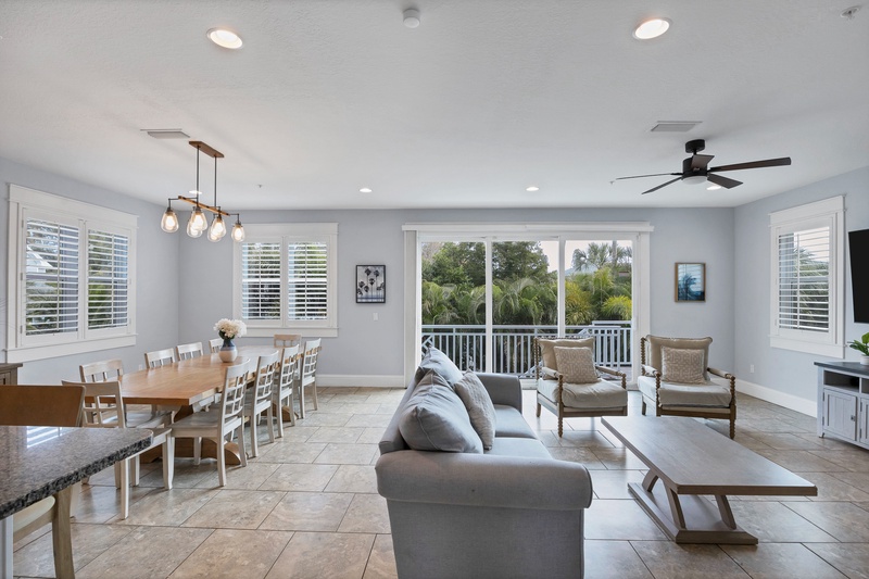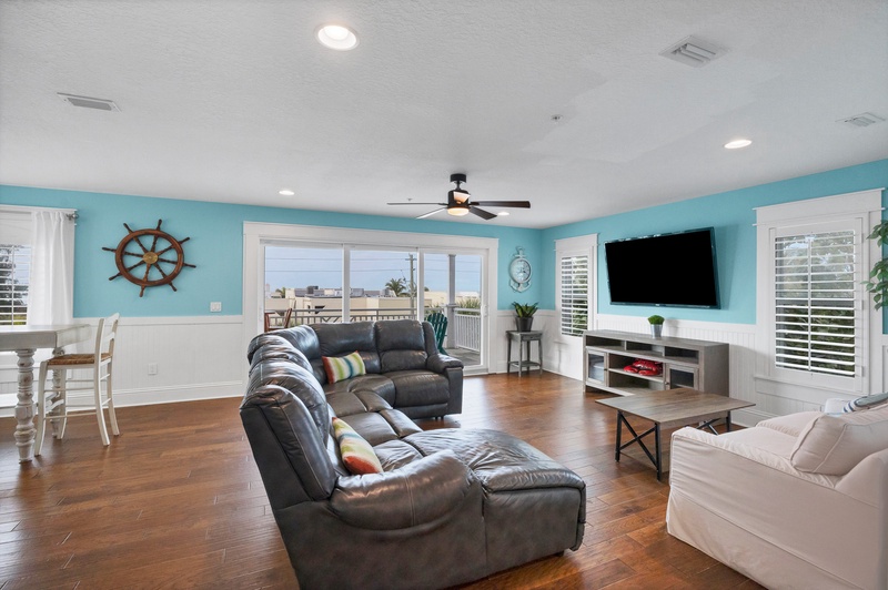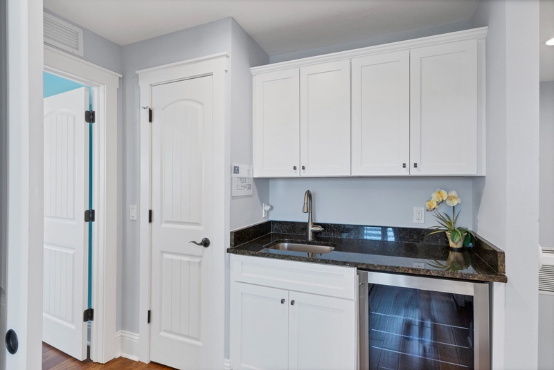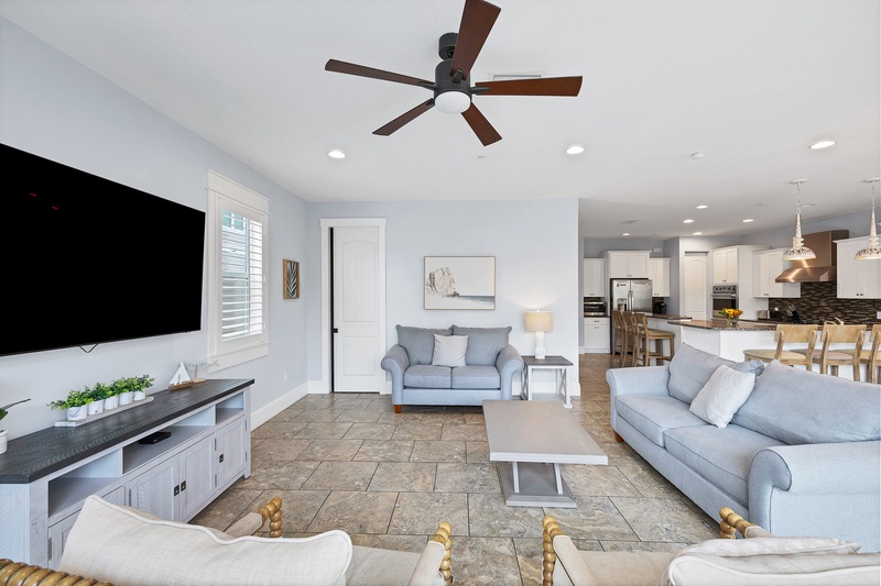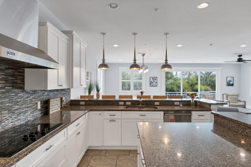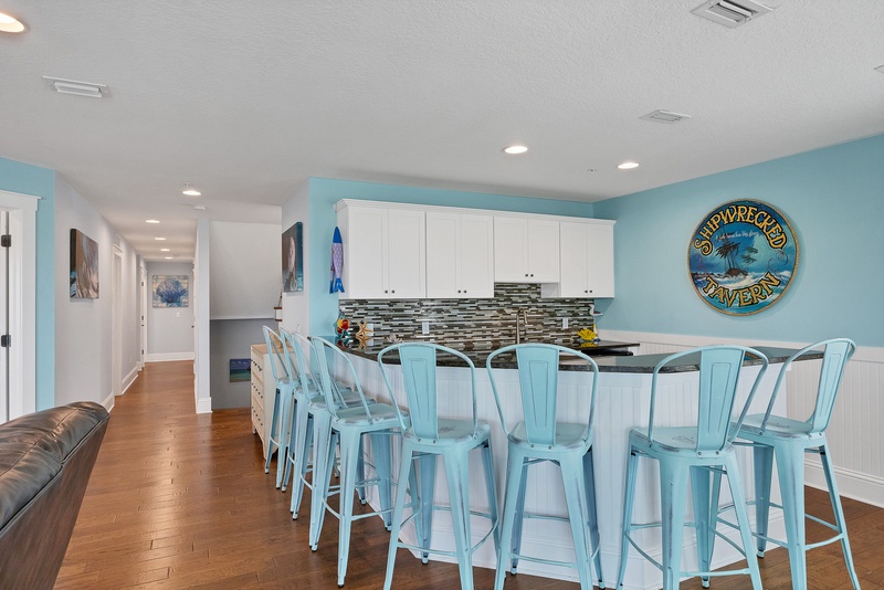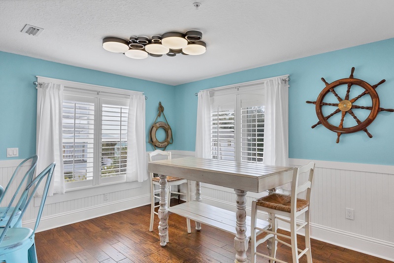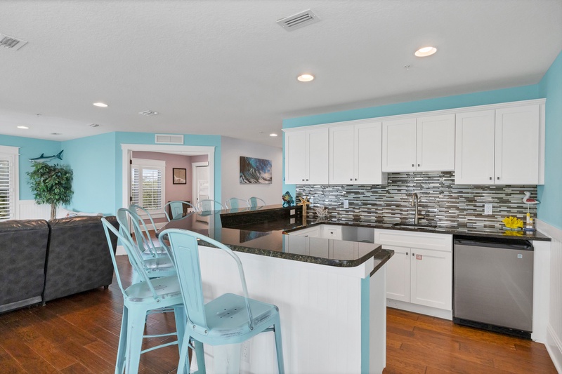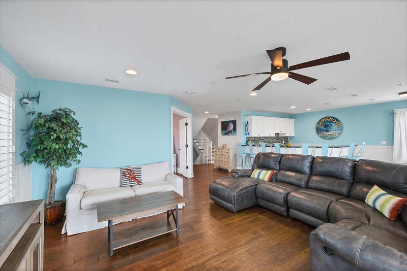 This lovely home features two distinct living areas. The first space includes a delightful nautical-themed seating area complete with a TV and a modern kitchen equipped with Viking appliances and everything you need to prepare a delicious meal. In addition, there is ample seating at the kitchen island and at the stylish dining table for guests to gather. The third-floor living area is equally impressive, featuring a large sectional, a new PlayStation to enjoy with the kids, dining table, and a wet bar with a wine fridge.