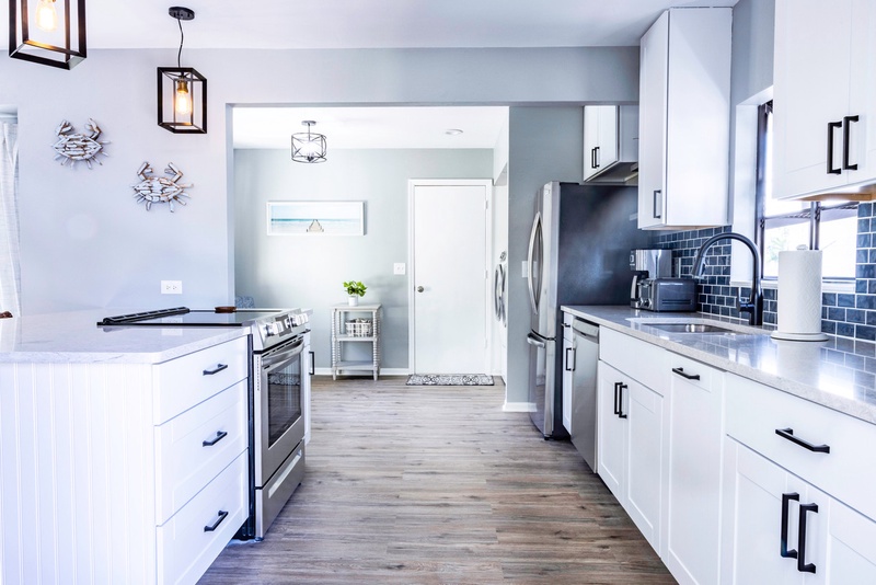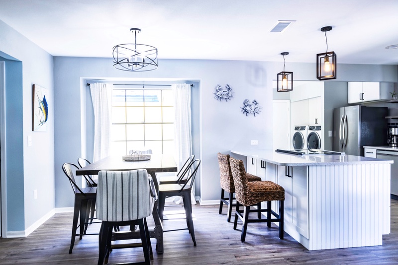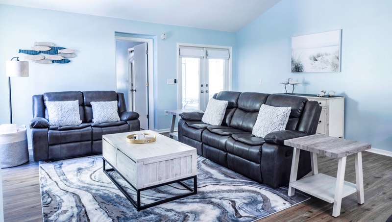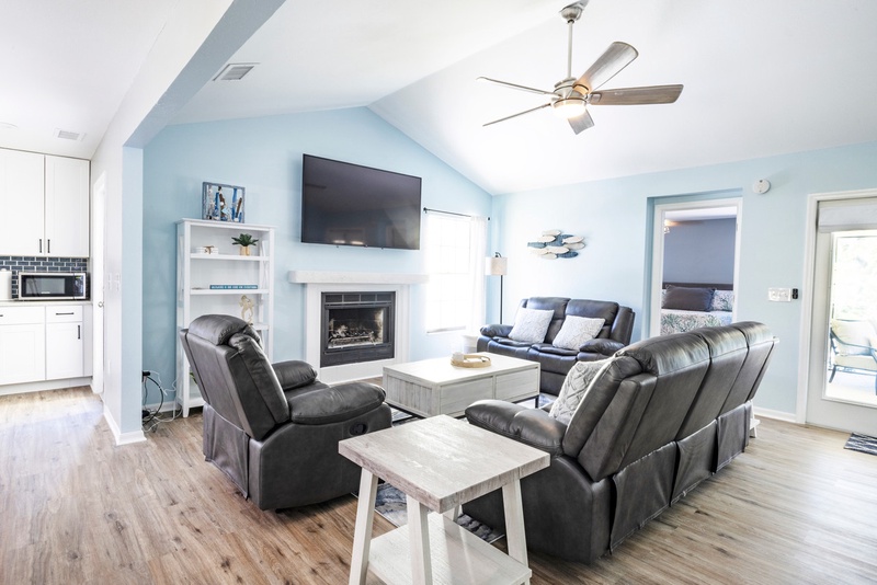 Step inside to an inviting open layout that exudes warmth and comfort. The family room features plush recliner sofas and a flat-screen TV, creating the ideal setting for cozy movie nights or lively family game sessions. The newly upgraded kitchen is a chef’s delight, equipped with stainless steel appliances and cooking essentials. While your delicious meal simmers on the stove, enjoy a drink at the stylish kitchen island or gather around the bright dining area that comfortably seats all guests for memorable meals together.