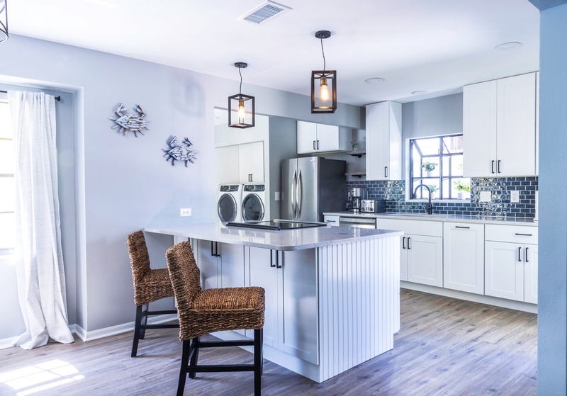 The primary bedroom is a tranquil oasis featuring a King-size bed, direct access to the lanai, and an ensuite bathroom with a double vanity and spacious walk-in shower—perfect for two people to get ready simultaneously. The second bedroom is furnished with a comfortable Queen bed, while the whimsical third bedroom offers a full-over-full bunk bed with a trundle, ideal for children or additional guests. A fully updated hallway bathroom includes a double vanity and shower-tub combination for added convenience. For practical needs, a washer and dryer are conveniently located next to the kitchen.