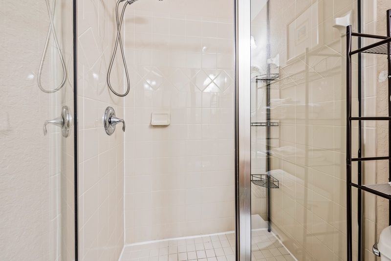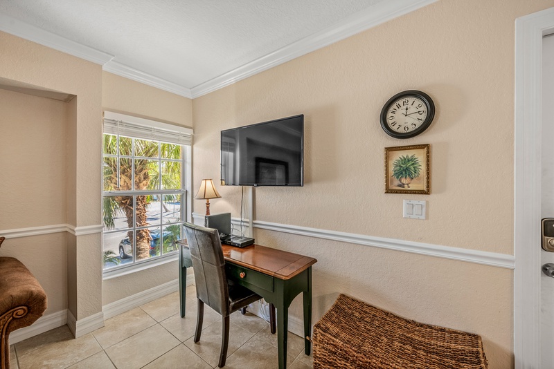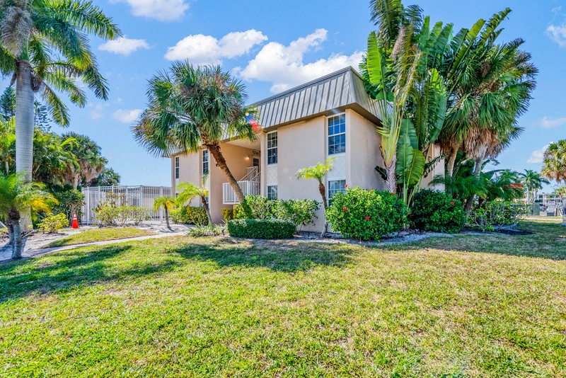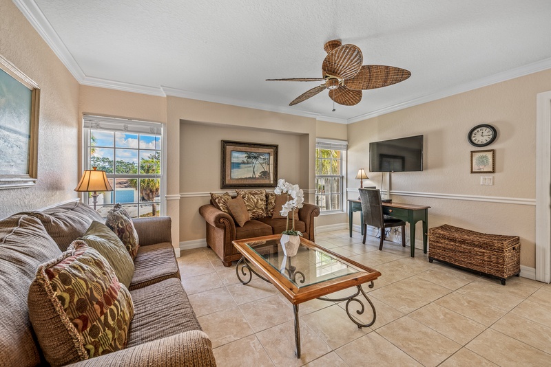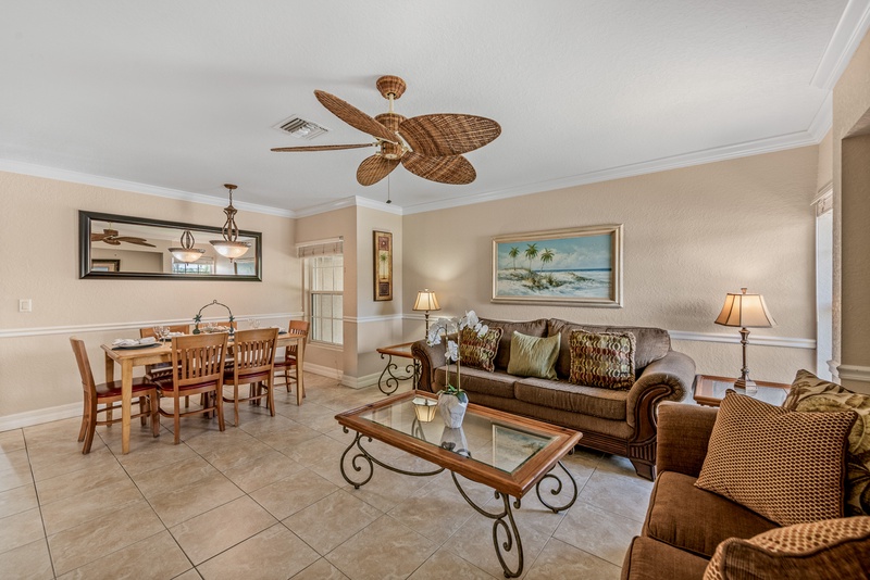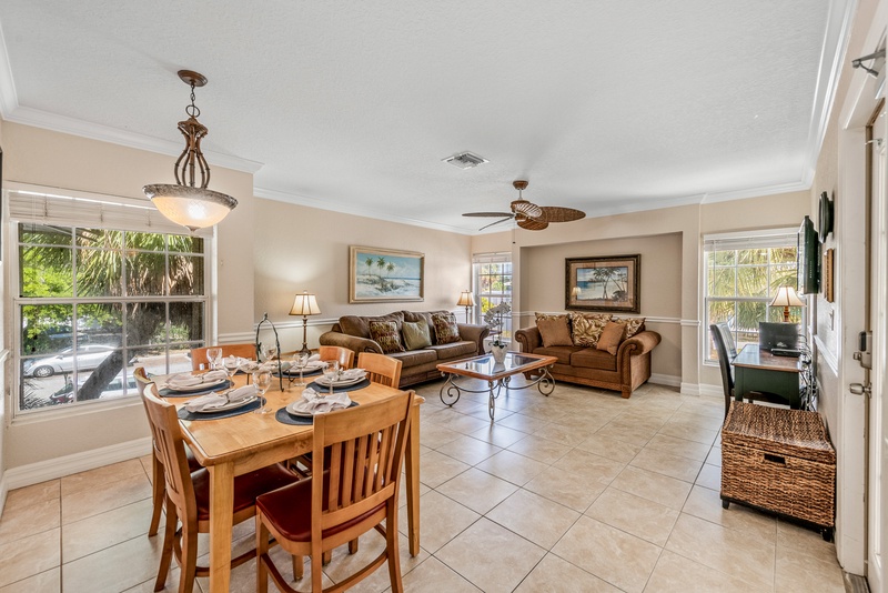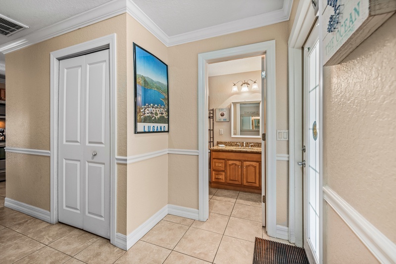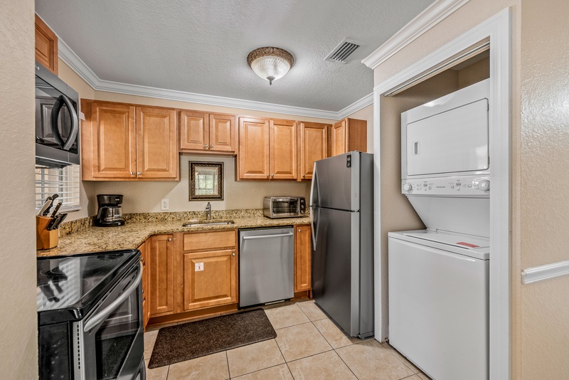 Walking in, you will feel the warm Florida vibe with a bright, open living space with two plush sofas and a flat-screen TV. The kitchen has stainless steel appliances and cooking essentials, including pots, pans, and utensils. Enjoy meals at the dining room table with a glass of wine and good company. Down the hall is where you will find the unit’s washer and dryer.