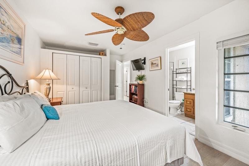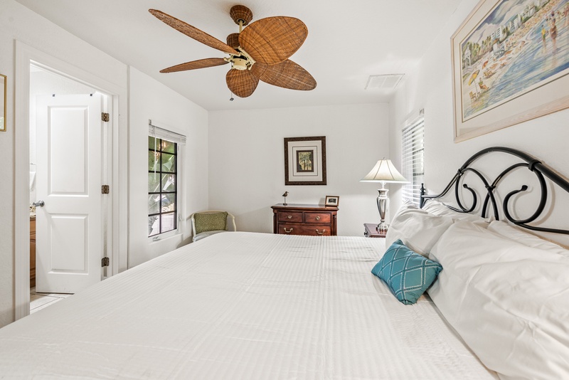 -Primary Bedroom: King bed and ensuite bathroom with walk-in shower