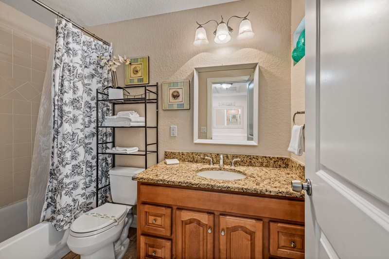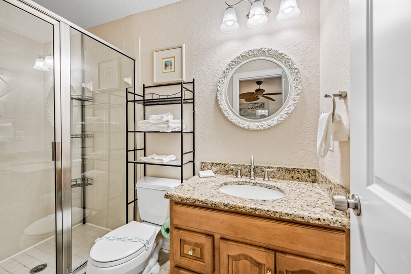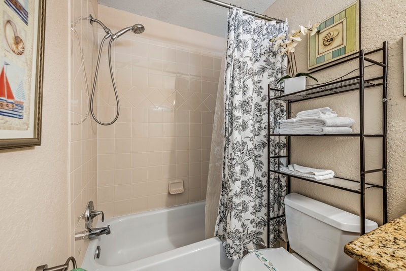 Unwind after splendid days spent at the beach in the primary bedroom with a premium mattress, closet space, and an ensuite bathroom with a walk-in shower. The second bedroom has a cozy beach theme and shares the hall bath with a shower and tub combination.