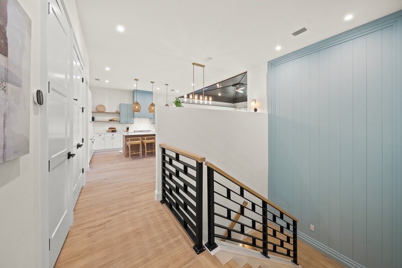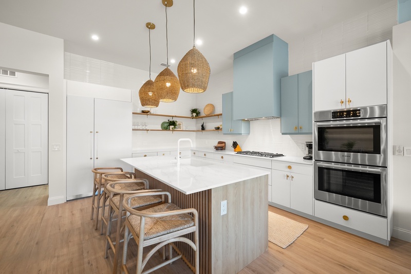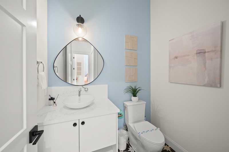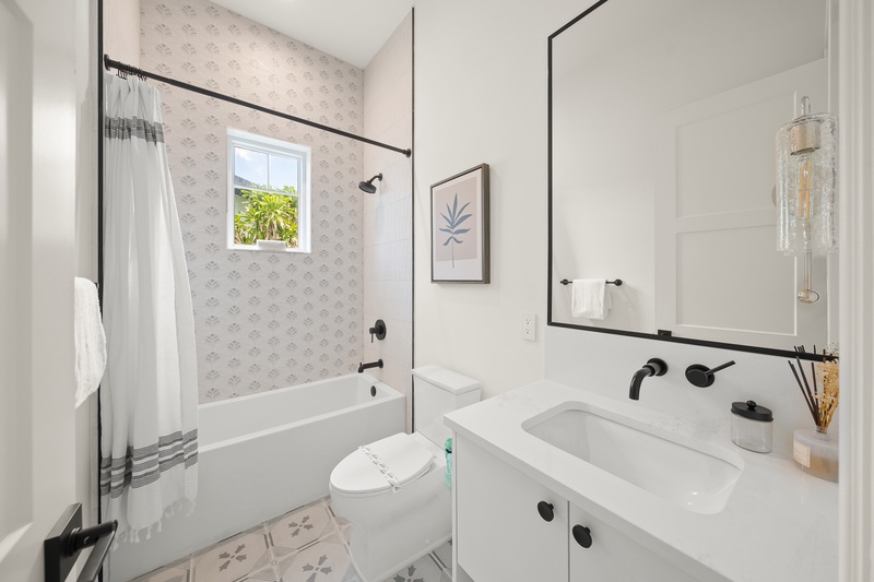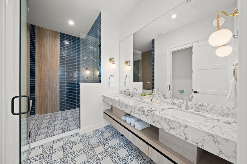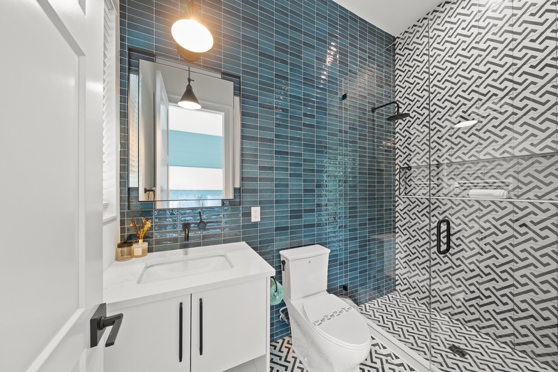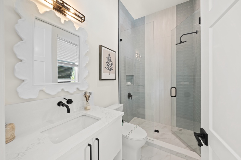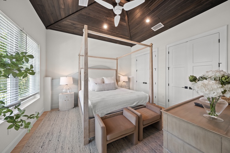 Your primary bedroom is a true oasis designed for relaxation with a plush king bed wrapped in soft linens. The ensuite bathroom is adorned with a double vanity, an enclosed walk-in shower with a soaking tub, and custom details to add to your experience. The three guest rooms are decorated with fun beach vibes, televisions, and dressers, and each bedroom has an ensuite bathroom with a walk-in shower for an added touch of privacy. A washer and dryer are available for guest use.