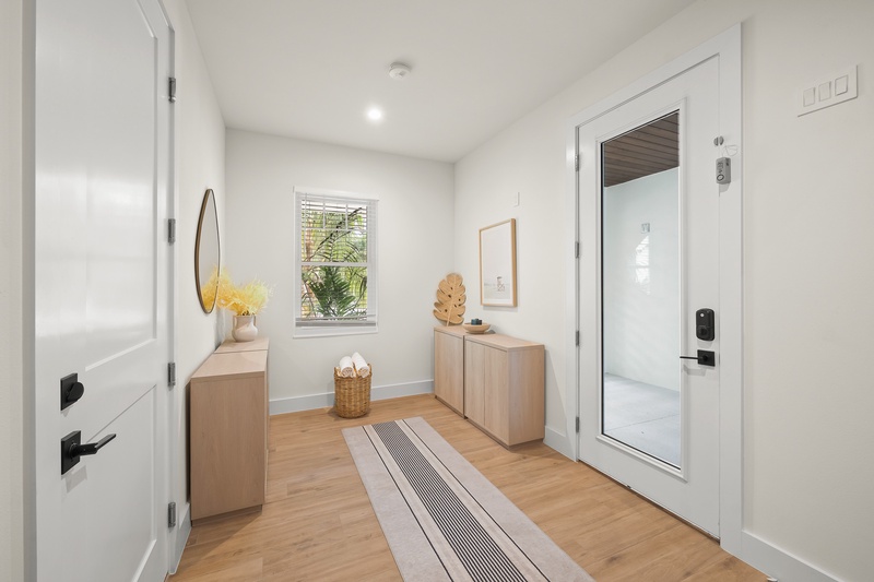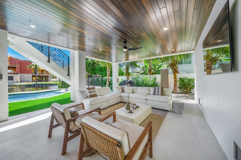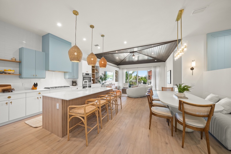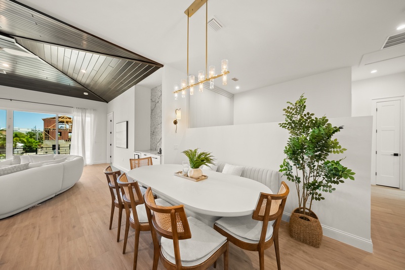 Step into luxury as you enter the great room, where an open floor plan welcomes you with its inviting seating area and expansive sliding doors, inviting the tropical breeze inside. The chic kitchen is a chef's dream, featuring top-of-the-line appliances and a generous center island adorned with comfortable barstools. And for those moments of indulgence, a sleek bar area awaits, complete with a wine fridge to complement your culinary creations at the elegant formal dining table.
