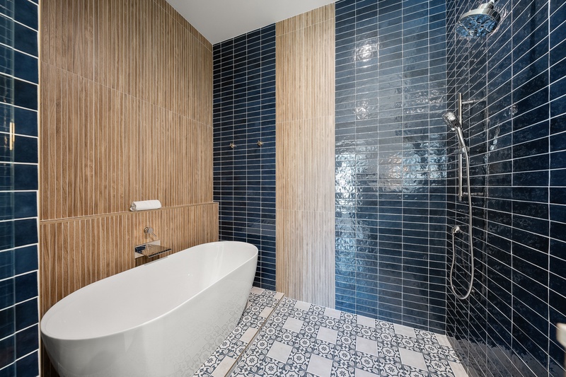 -Primary Bedroom: King bed and ensuite bathroom with walk-in shower and tub