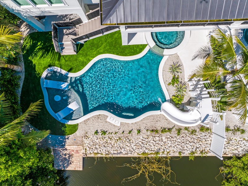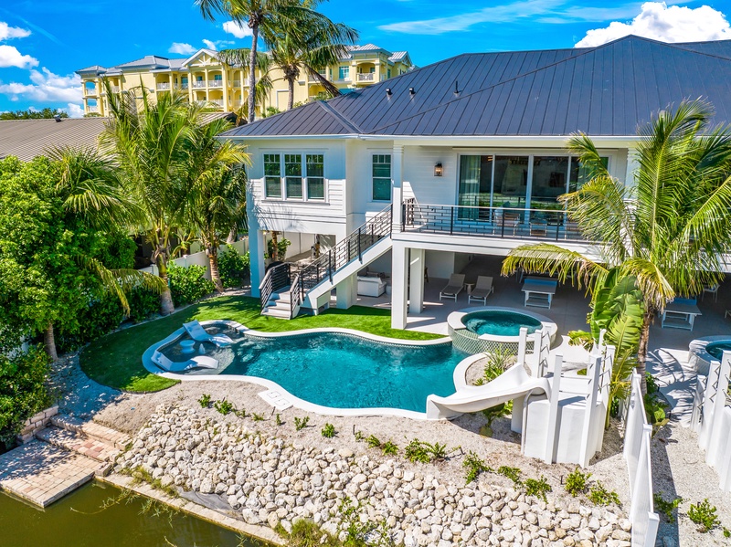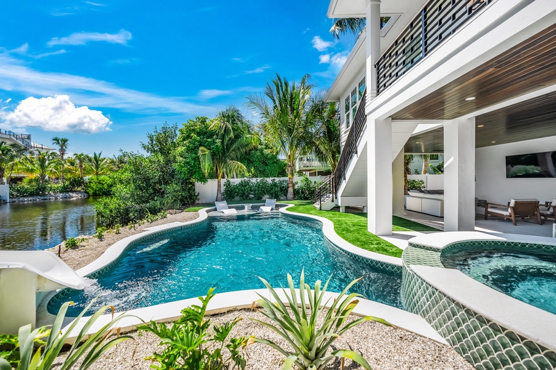 Escape to the ultimate getaway at Siesta Serenity! This four-bedroom, four-and-a-half-bath waterfront home offers everything you need for a perfect retreat. Dive into relaxation with a sparkling pool, spa, and waterslide, or gather with loved ones on the covered patio complete with a BBQ grill. Surround yourself with lush tropical landscaping and breathtaking water views, creating the ideal backdrop for your vacation.