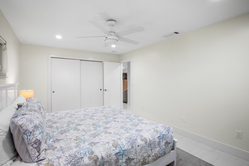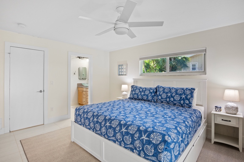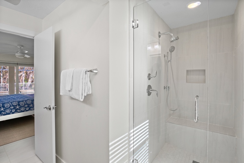 -Primary Bedroom: King bed and ensuite bathroom with walk-in shower