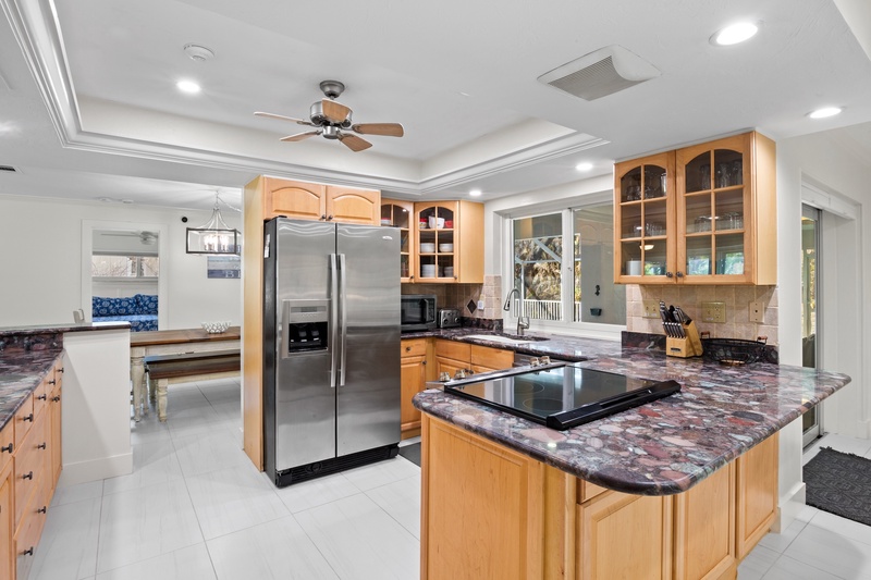 This bright, newly updated home has plenty of living space and comfortable seating for all your guests to spread and relax. The spacious kitchen has gorgeous maple cabinetry where you can store groceries and stainless steel, and it seamlessly opens to the formal dining room.