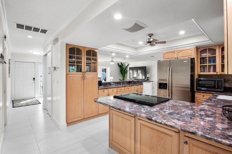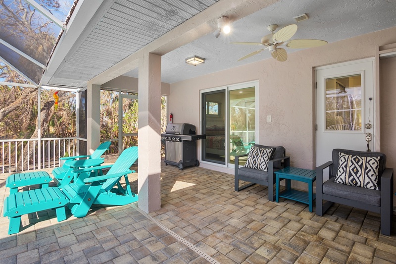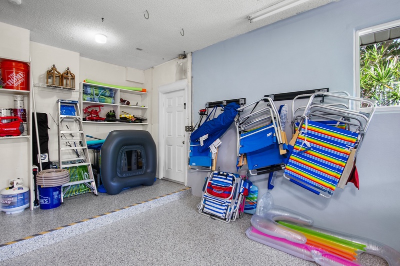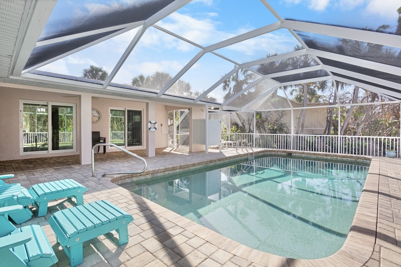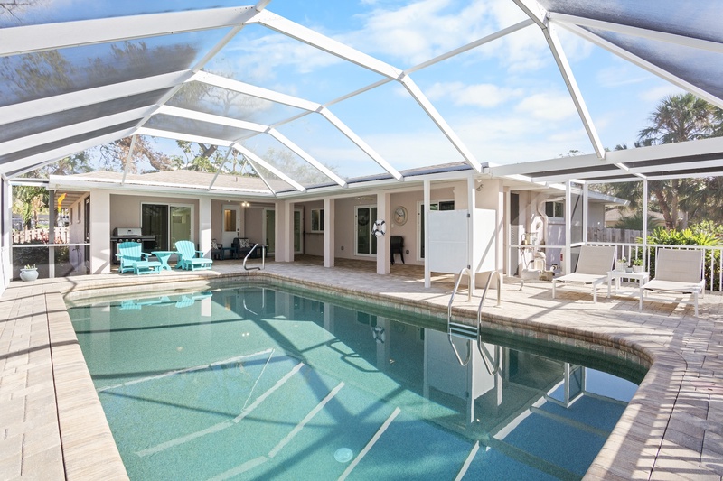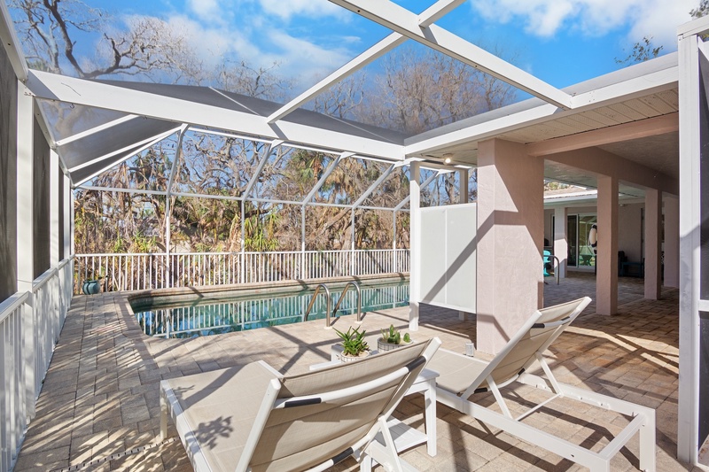 Step into your lanai and discover a sparkling pool surrounded by plenty of brick-paved patio space, perfect for chilling with friends and family. Rinse off after a beach day with the convenient outdoor shower. The tropically landscaped backyard is an adventure waiting to happen, perfect for fun games with friends and family or an energetic game of fetch with your dog!