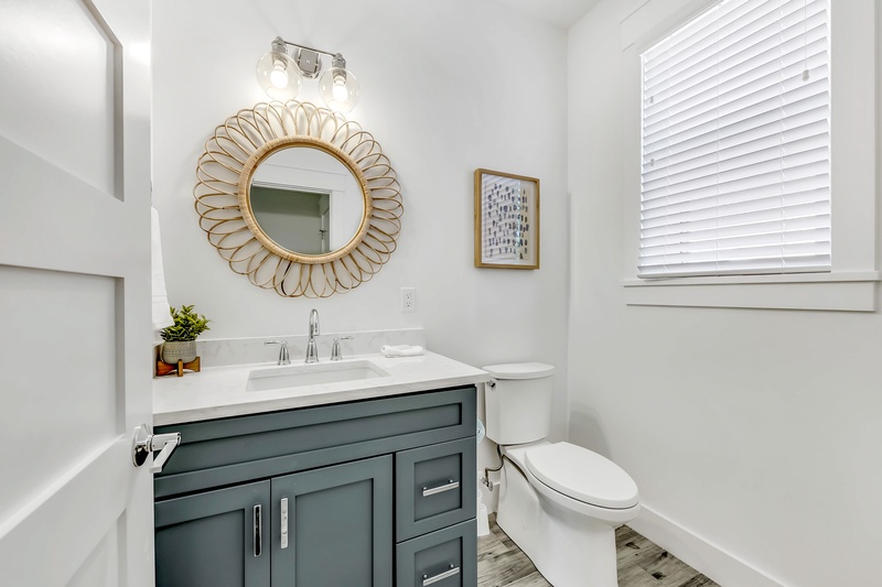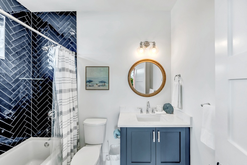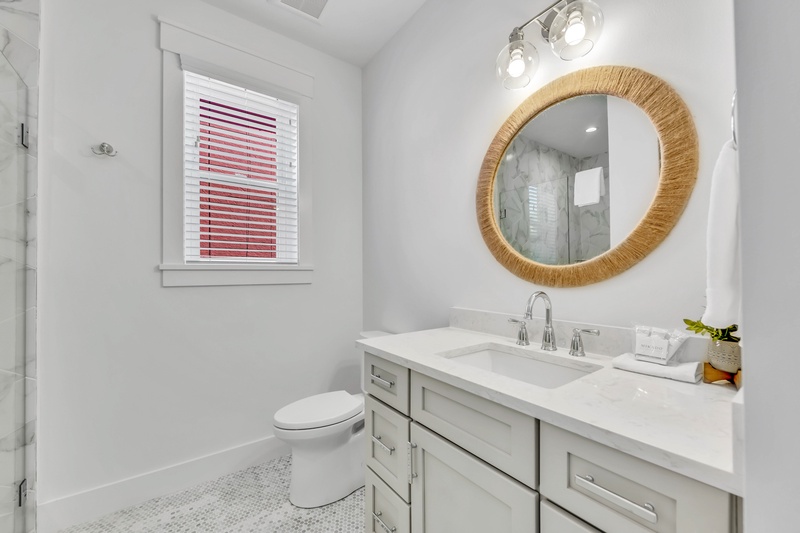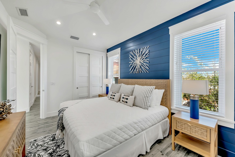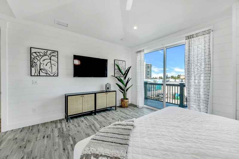 As you arrive at your piece of paradise, take the elevator or stairs to the main living floor, where you’ll find a large great room with a fully equipped kitchen and island seating, a bright seating area with sofas and a TV, a chic dining room table, and a balcony that overlooks the pool. Just down the hall is a half bathroom, and for your convenience, there is a washer and dryer to keep your beach towels and clothes clean.