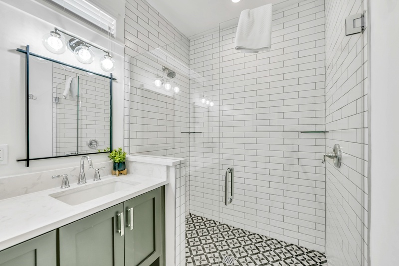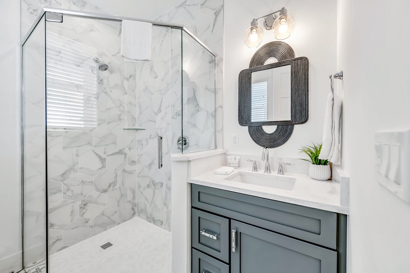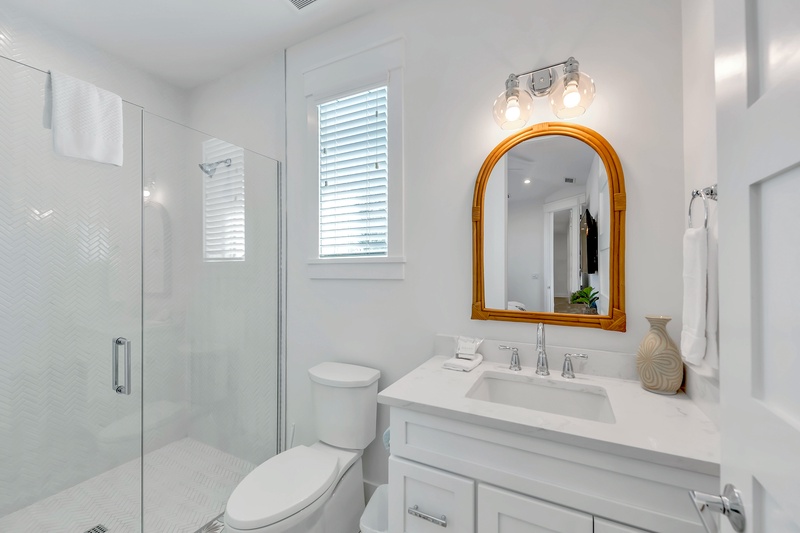 -Seventh Bedroom, 2nd floor: King bed and ensuite bathroom with walk-in shower