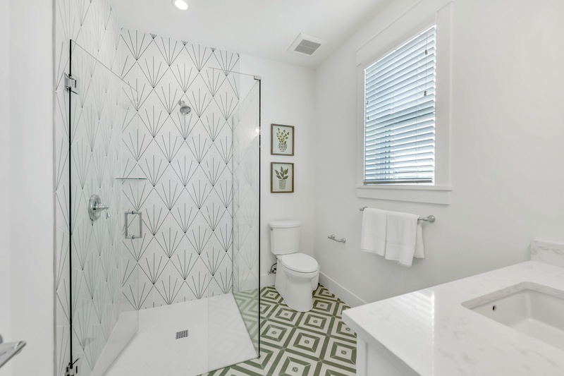 On the third floor is a second living room with a TV and five bedrooms. The primary bedroom offers a peaceful retreat with a private balcony, an ensuite bathroom with a double vanity, and a walk-in shower with unique tiles. Three upstairs bedrooms have King beds, TVs, and adorable ensuite bathrooms with walk-in showers. The fifth bedroom is designed for the kiddos with a bunk bed and an ensuite bathroom with a shower and tub combination, and this room has a balcony. On the lower level are the remaining two bedrooms featuring King beds, plenty of closet space, and ensuite bathrooms with walk-in showers.