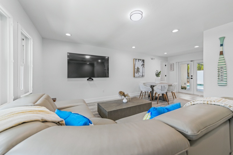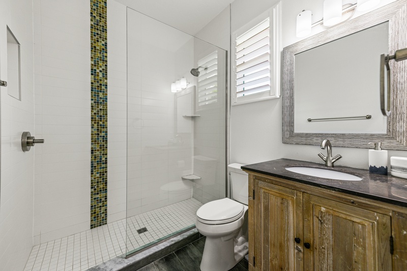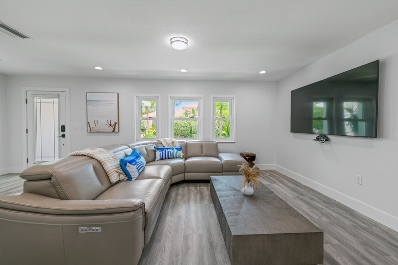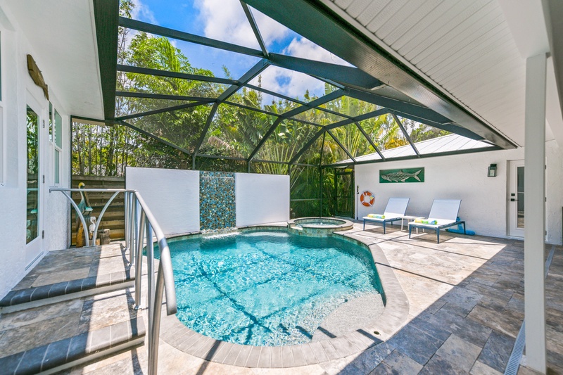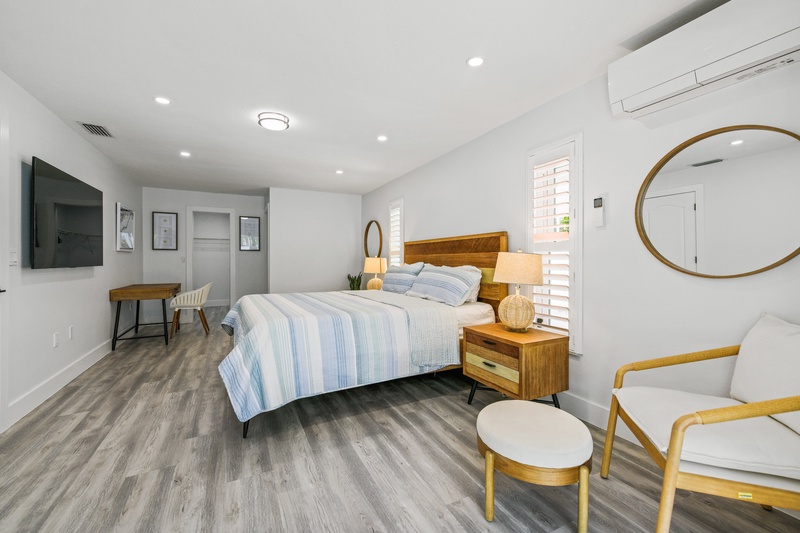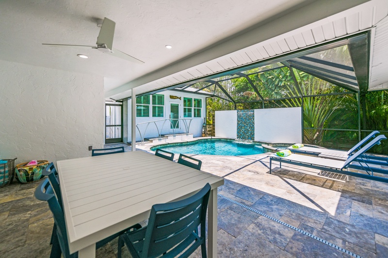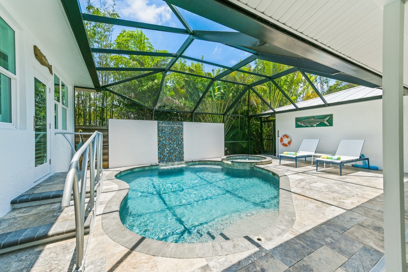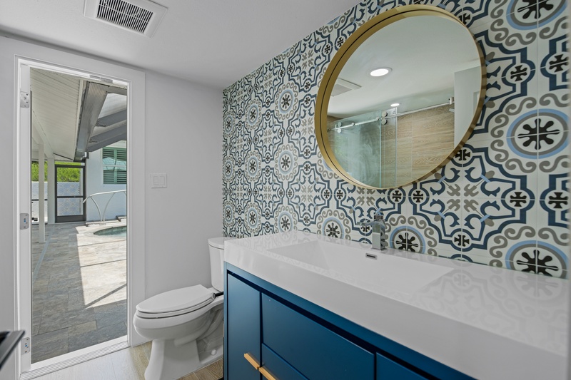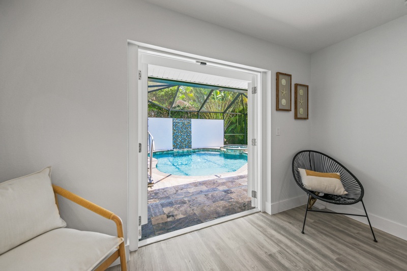 The main house has three bedrooms and two bathrooms, and the guest house is apartment-like, with one bedroom and one bathroom. The primary bedroom has chic furnishings with seating, a desk, and private doors leading to the pool. The primary ensuite bathroom has a double vanity and a walk-in shower with floor-to-ceiling unique tiling. The second and third bathrooms have built-in storage, making it easy to see every vacation outfit for the trip, and TVs for late-night entertainment. The second bathroom has access from the hallway and the pool area. The guest house is accessed from the screened-in pool area. It has two queen beds and an ensuite bathroom with a walk-in shower.