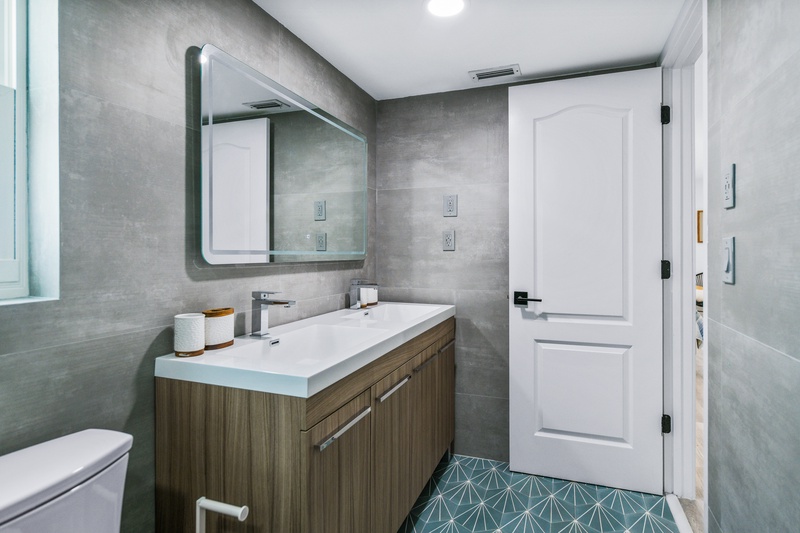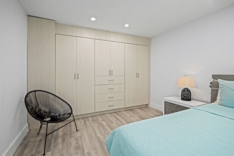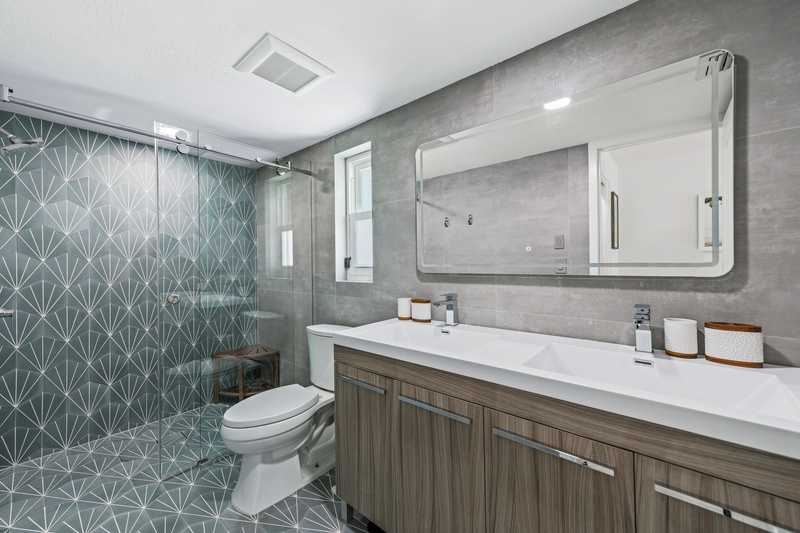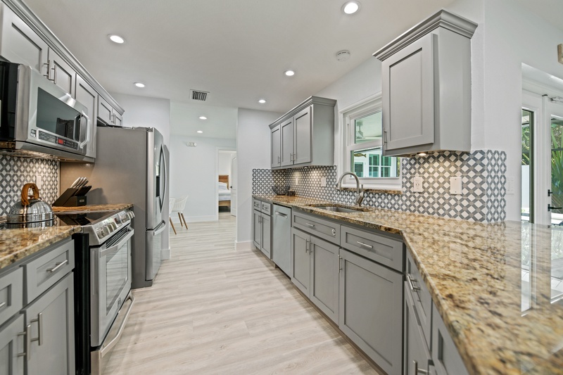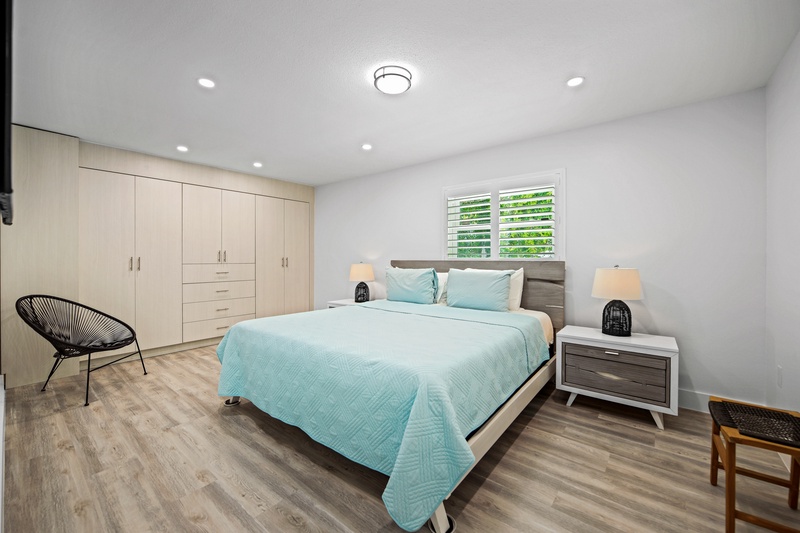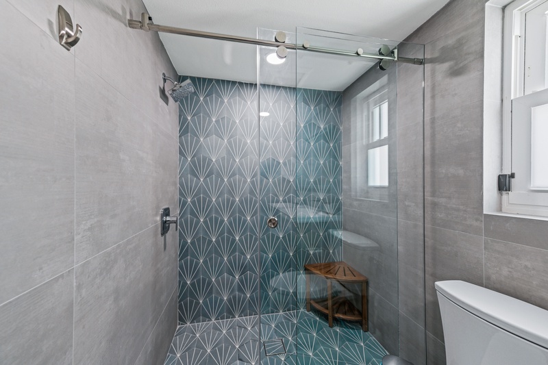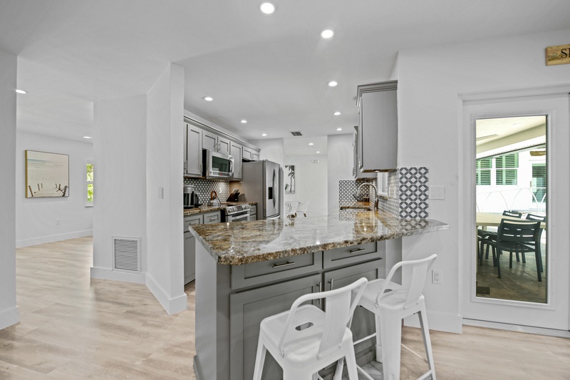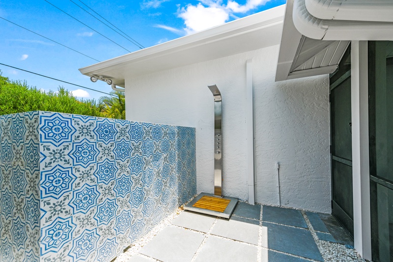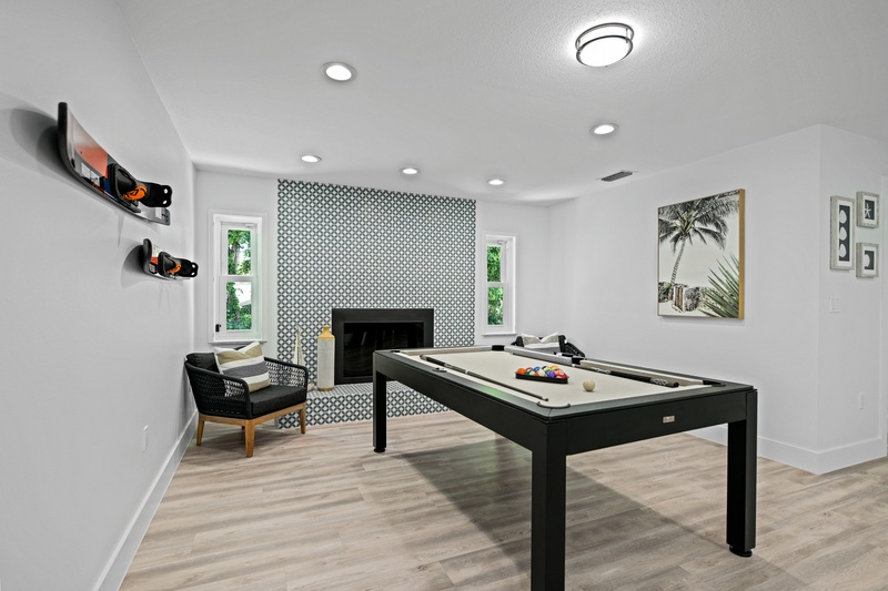 The main house has three bedrooms and two bathrooms, and the guest house is apartment-like, with one bedroom and one bathroom. The primary bedroom has chic furnishings with seating, a desk, and private doors leading to the pool. The primary ensuite bathroom has a double vanity and a walk-in shower with floor-to-ceiling unique tiling. The second and third bathrooms have built-in storage, making it easy to see every vacation outfit for the trip, and TVs for late-night entertainment. The second bathroom has access from the hallway and the pool area. The guest house is accessed from the screened-in pool area. It has two queen beds and an ensuite bathroom with a walk-in shower.