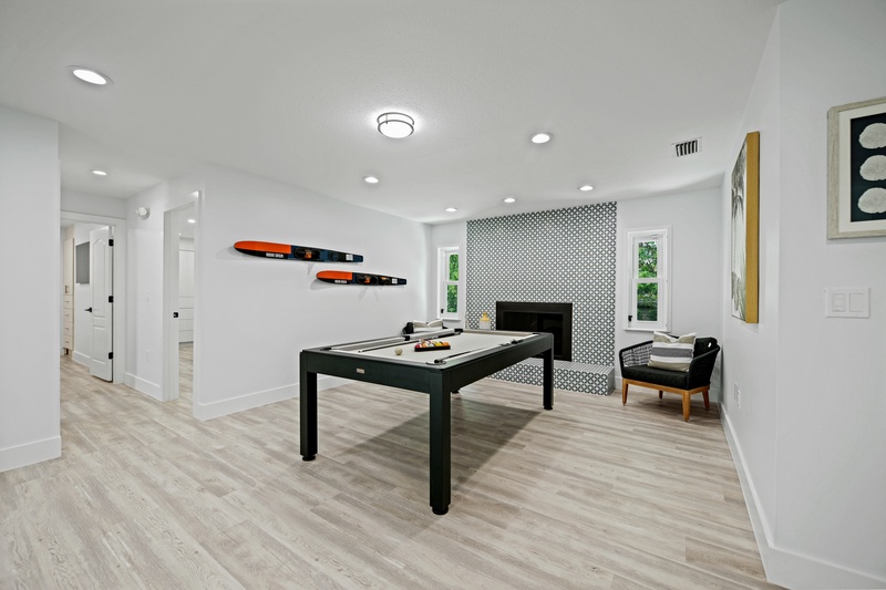 As you enter your new annual tradition, you’ll feel all your stress disappear. Guests can relax on the large sectional and watch a movie in the living room or head to the den to practice their pool skills. The kitchen has high-end stainless steel appliances, cooking essentials, including pots, pans, and utensils, and sweeping granite countertops with bar seating, and off to the right is a dining table. There is an additional living area with a sleeper sofa and a TV, with plenty of room for games.